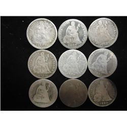 9 ASSORTED 1880'S & 90'S SEATED LIBERTY DIMES