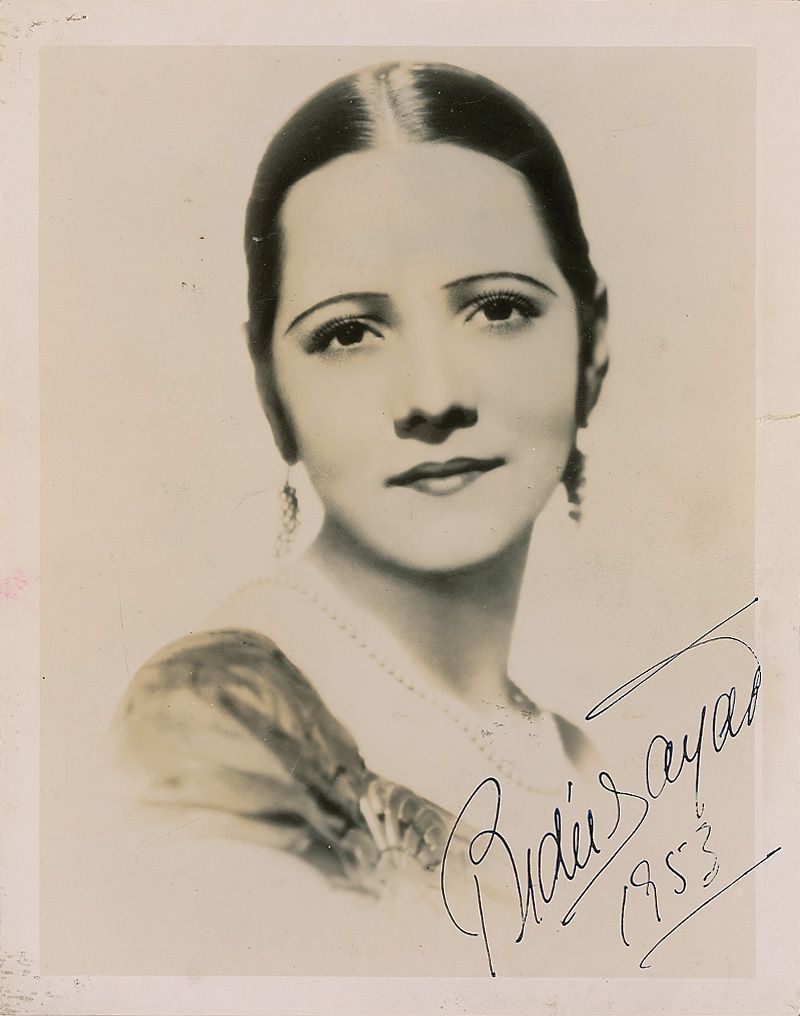 Brazilian opera soprano (1902-1999), she was a leading artist of New York’s Metropolitan Opera from 1932 to 1952. Vintage glossy 8 x 10 photo, signed in fountain pen, “Bidu Sayao, 1953.” Staple holes in top left, a tear to the right border, and light soiling along the bottom, otherwise fine condition.