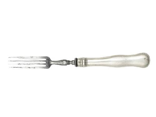 Shaped silver terminal, four pronged steel fork. Marked: Sopron, circa 1840, Marcus Buk. Koszeghy: 2031. Length: 22 cm