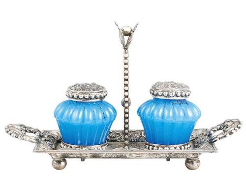 Silver, 124 g. Miniature tray with handles raised on ball feet with handle in the middle, blue rice-stone bottles blown into form (inkpot and writing-sand). Silver caps. Marked: Vienna, 1844, Jakob Weiss, Imperial and Royal Court Carrier. Neuwi
