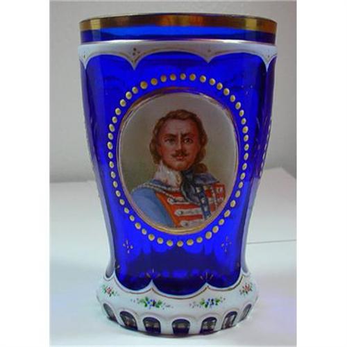 Biedermeier Painted and enameled cobalt blue glass cup. A painted cartouche on the face features a dashing mustachioed early 19th-century French military figure in a light blue and red uniform. A complementary polychrome floral cartouche appears on the back. Enameled white scalloped top and bottom borders feature small-scale floral motifs. Gold rim and detailing.