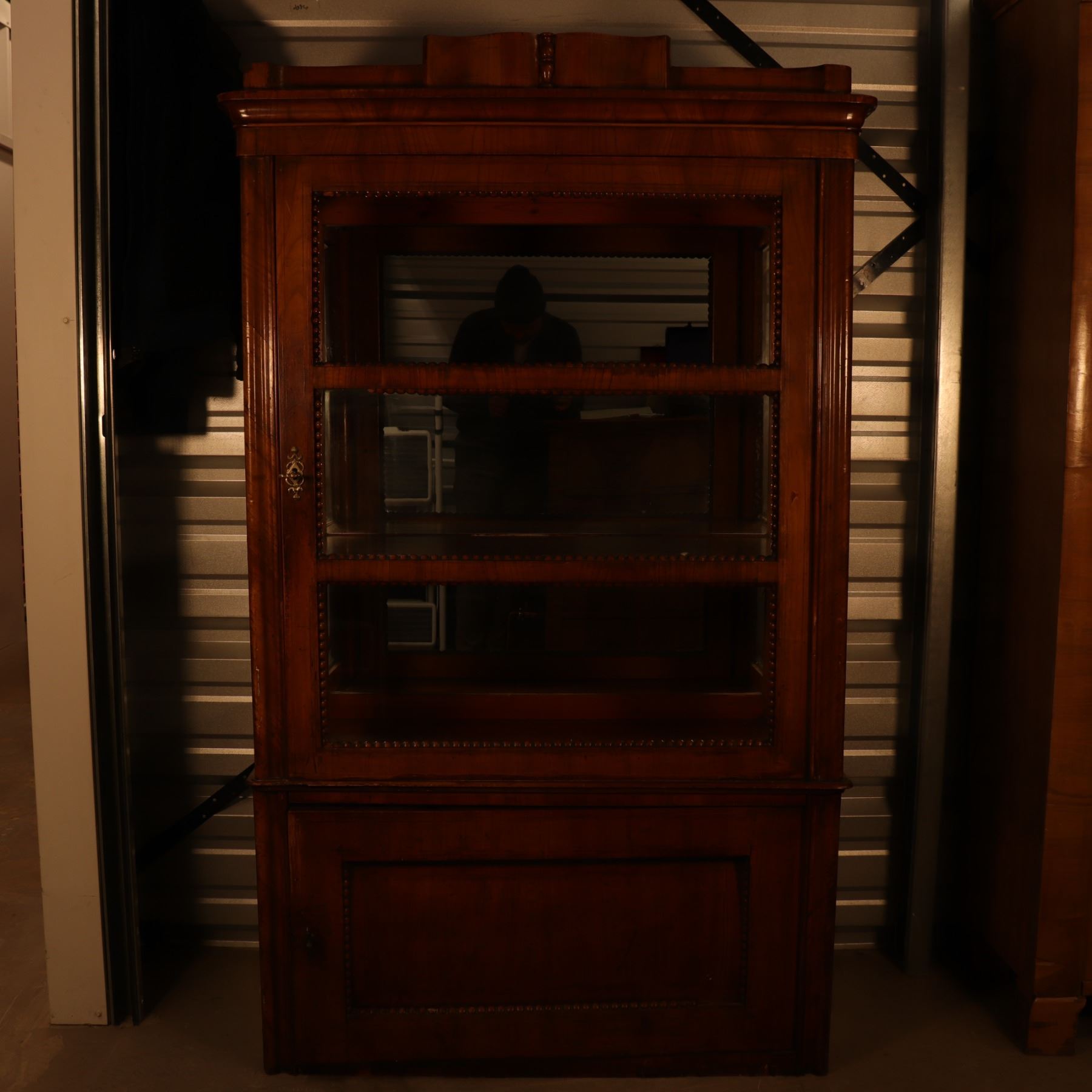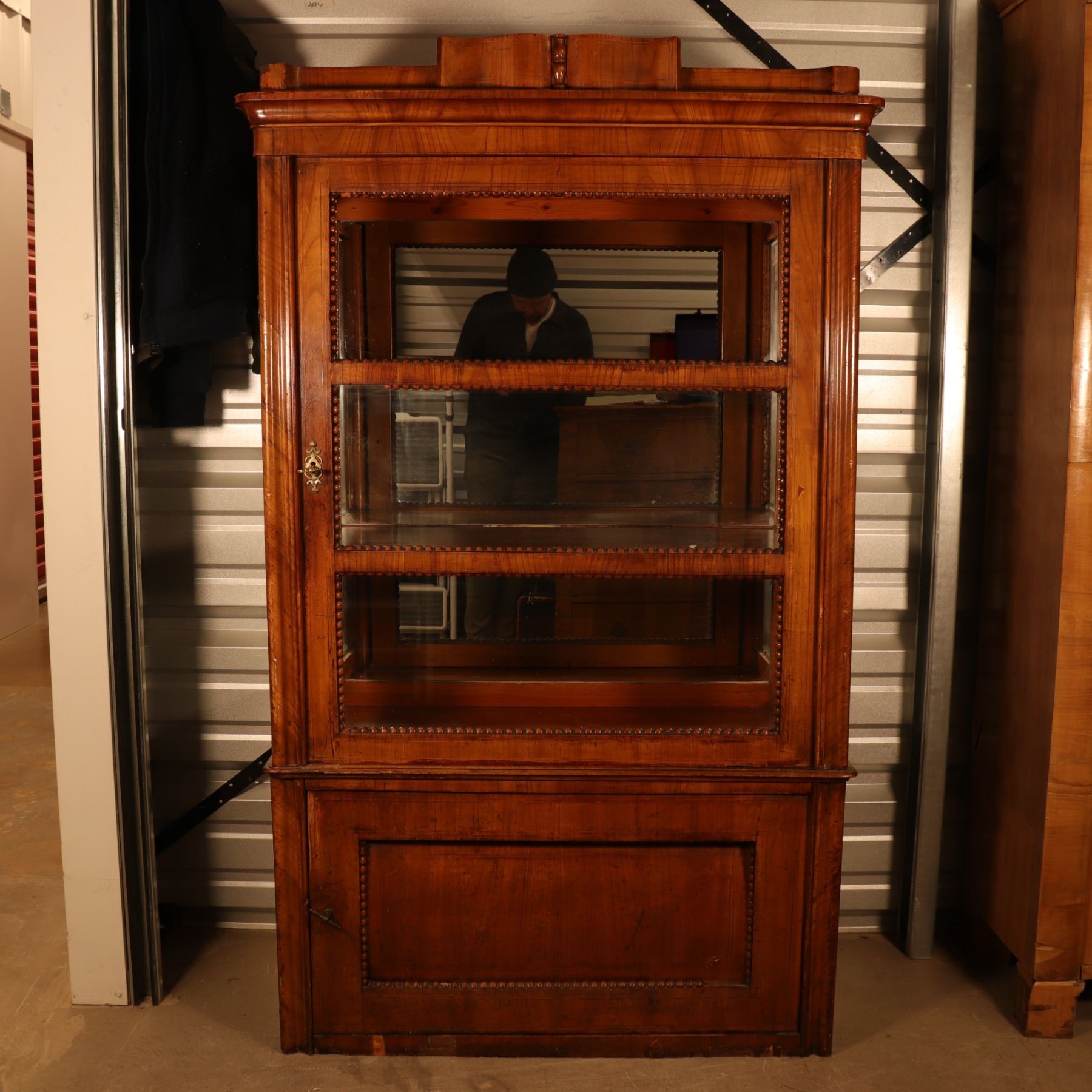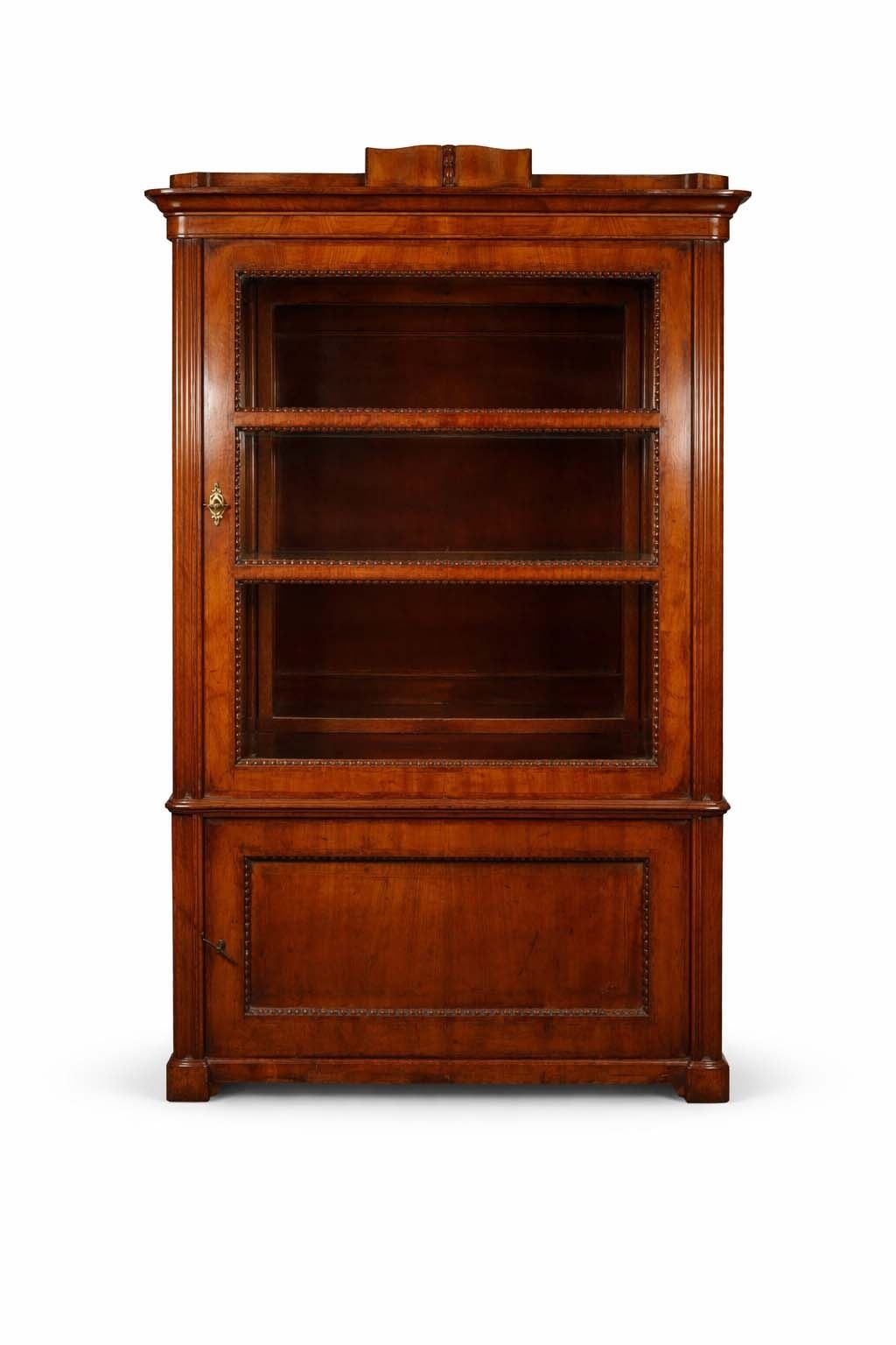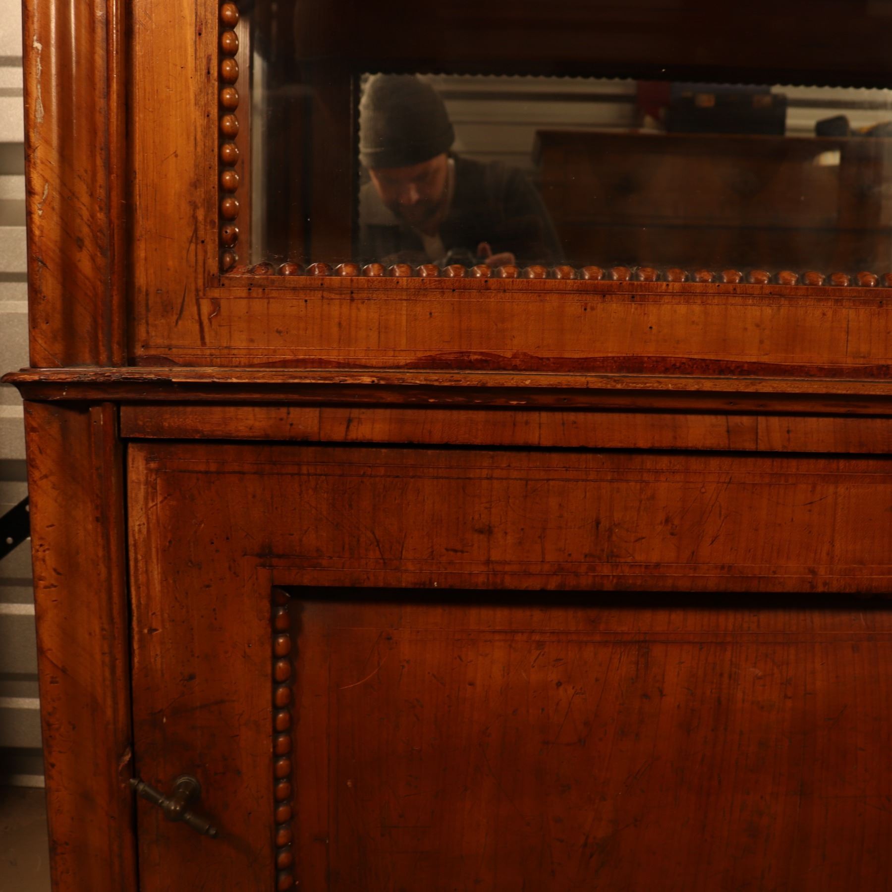Single-door glazed display cabinet or small bookcase in figured veneer, with beaded inner framing and lower paneled compartment. General surface wear, scratches, and finish rubbing. Wood panel on the door is bowed. 37x64x18.5