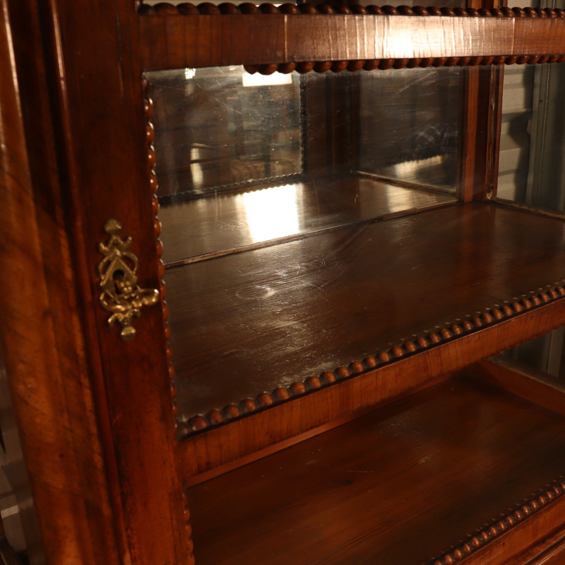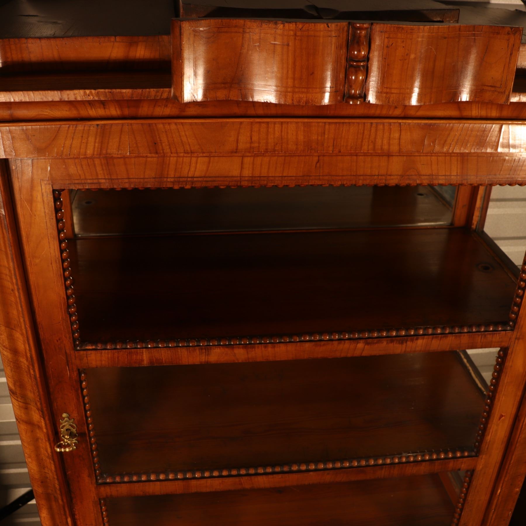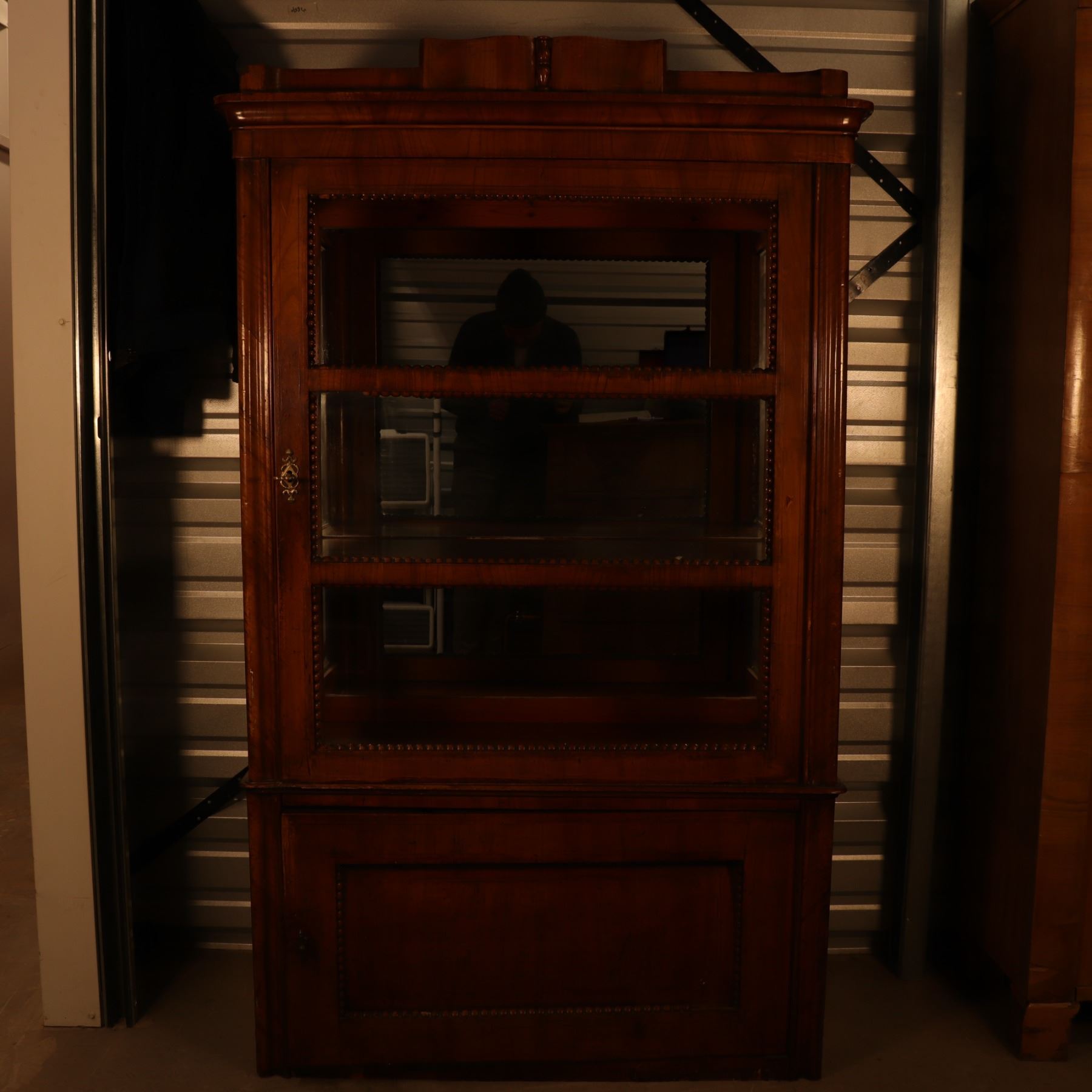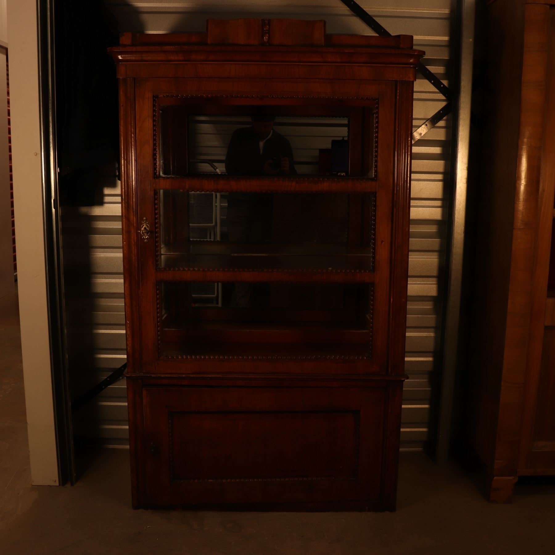 Single-door glazed display cabinet or small bookcase in figured veneer, with beaded inner framing and lower paneled compartment. General surface wear, scratches, and finish rubbing. Wood panel on the door is bowed. 37x64x18.5