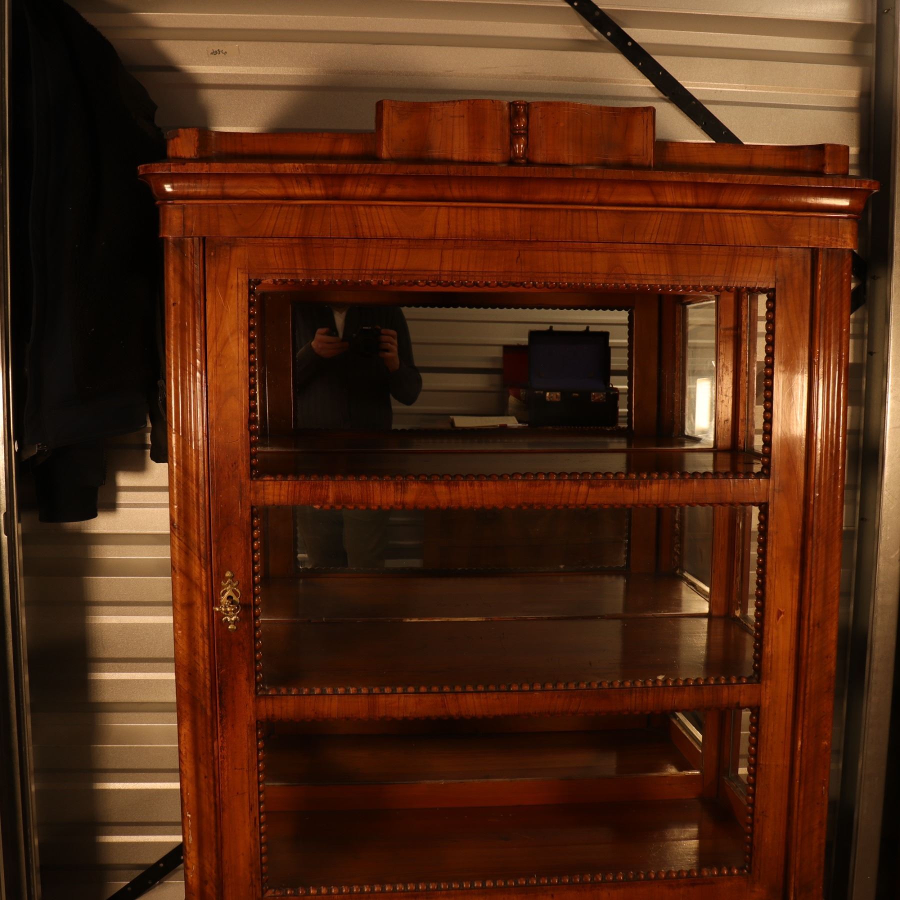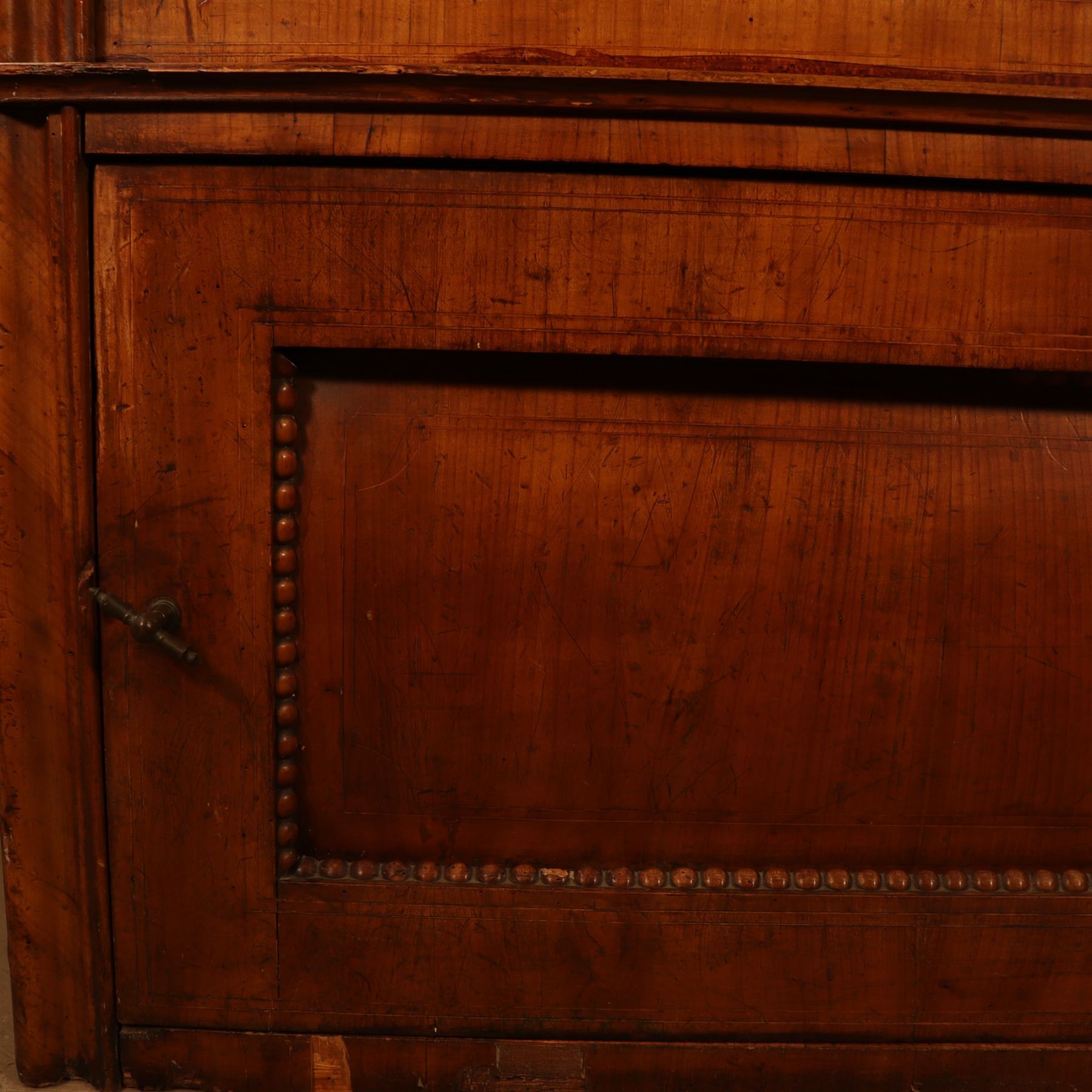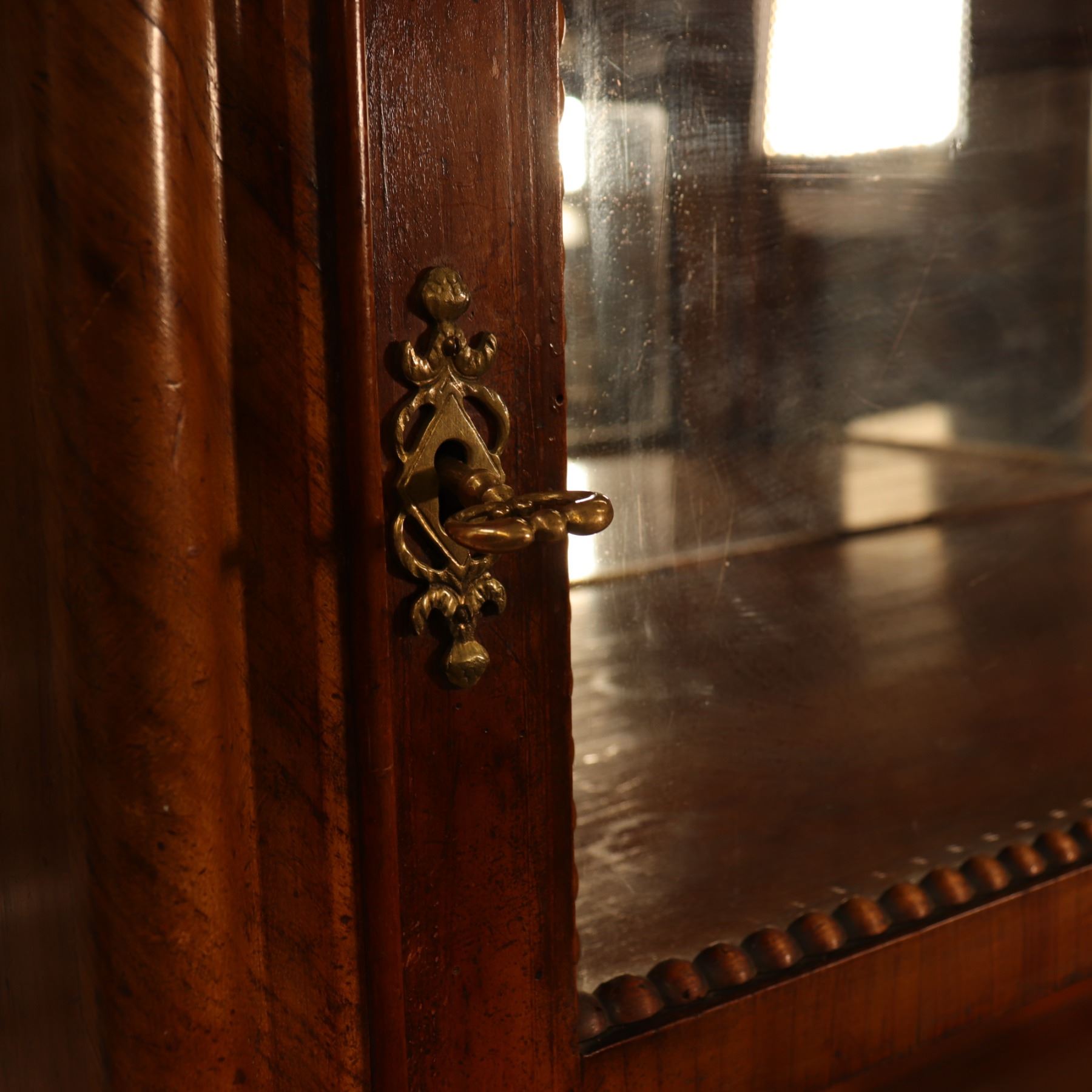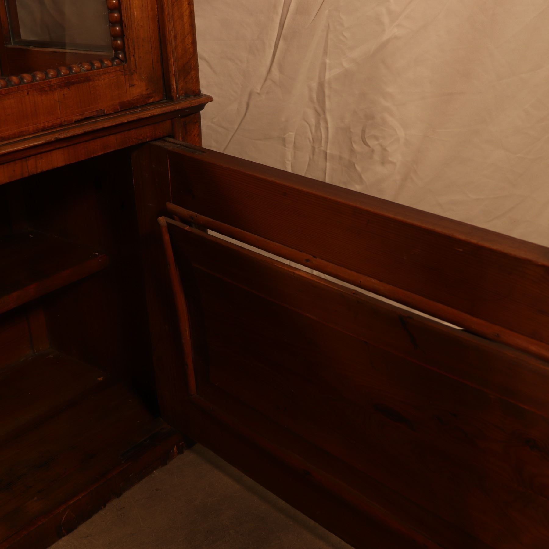 Single-door glazed display cabinet or small bookcase in figured veneer, with beaded inner framing and lower paneled compartment. General surface wear, scratches, and finish rubbing. Wood panel on the door is bowed. 37x64x18.5