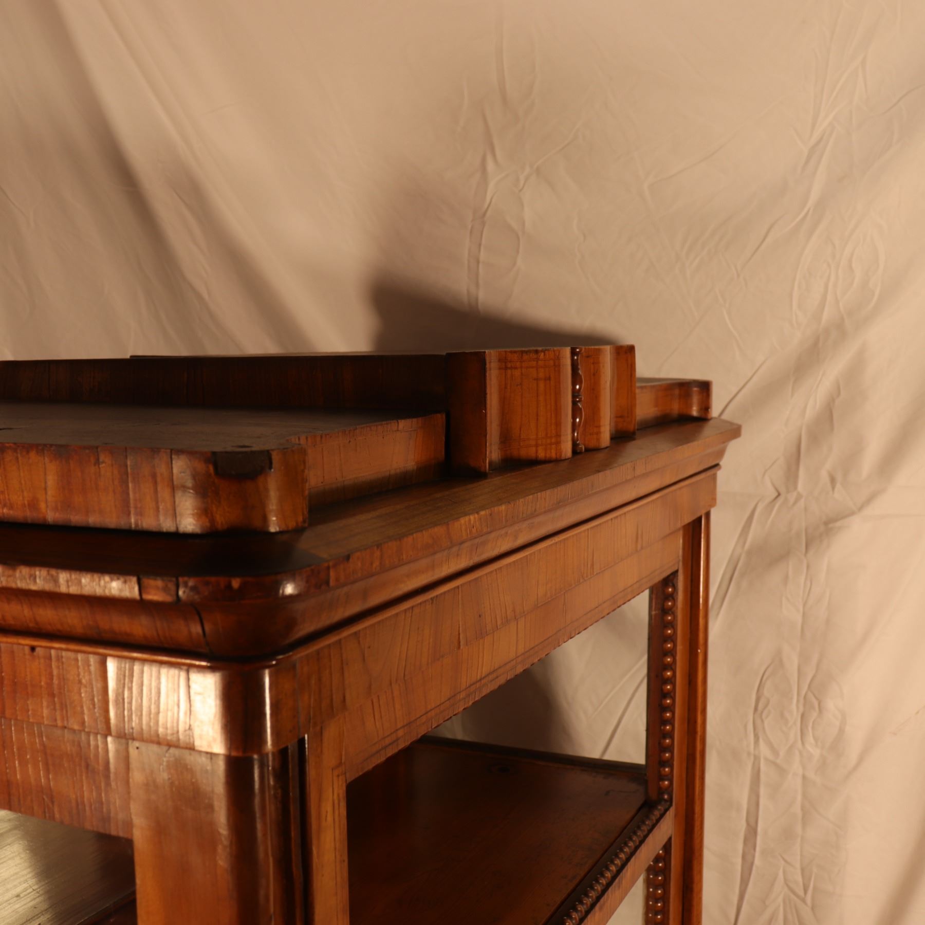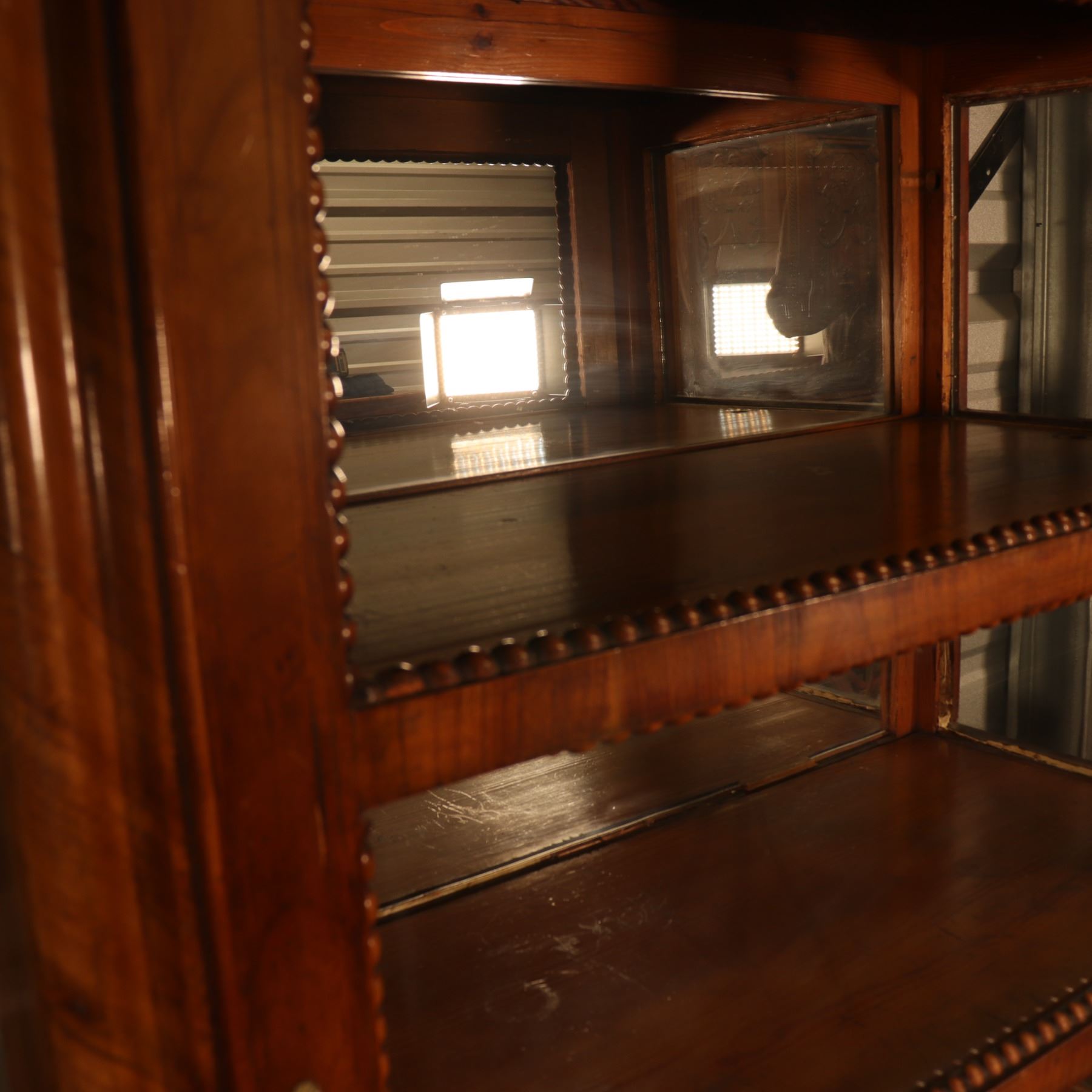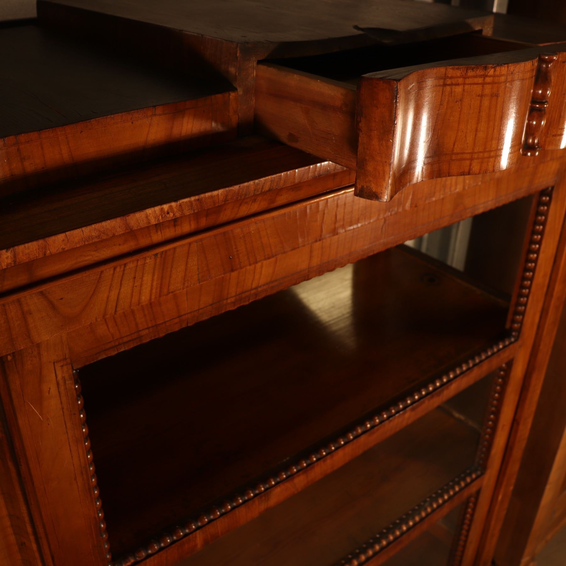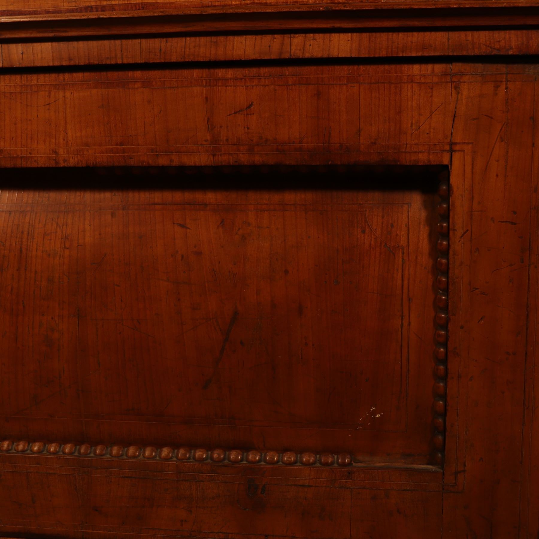 Single-door glazed display cabinet or small bookcase in figured veneer, with beaded inner framing and lower paneled compartment. General surface wear, scratches, and finish rubbing. Wood panel on the door is bowed. 37x64x18.5
