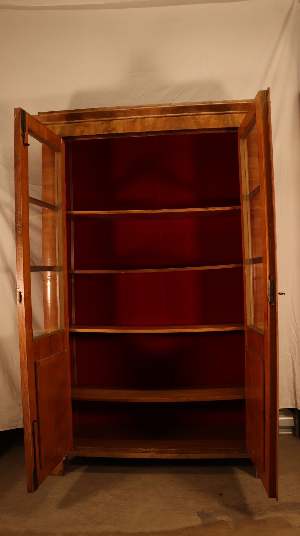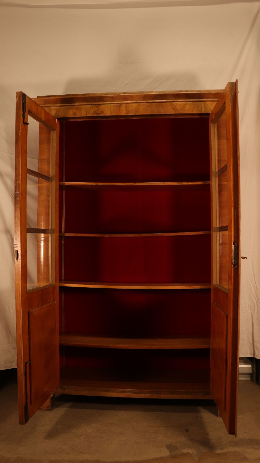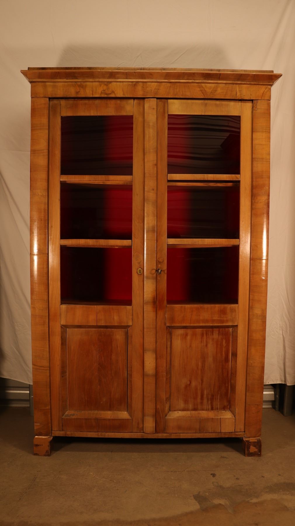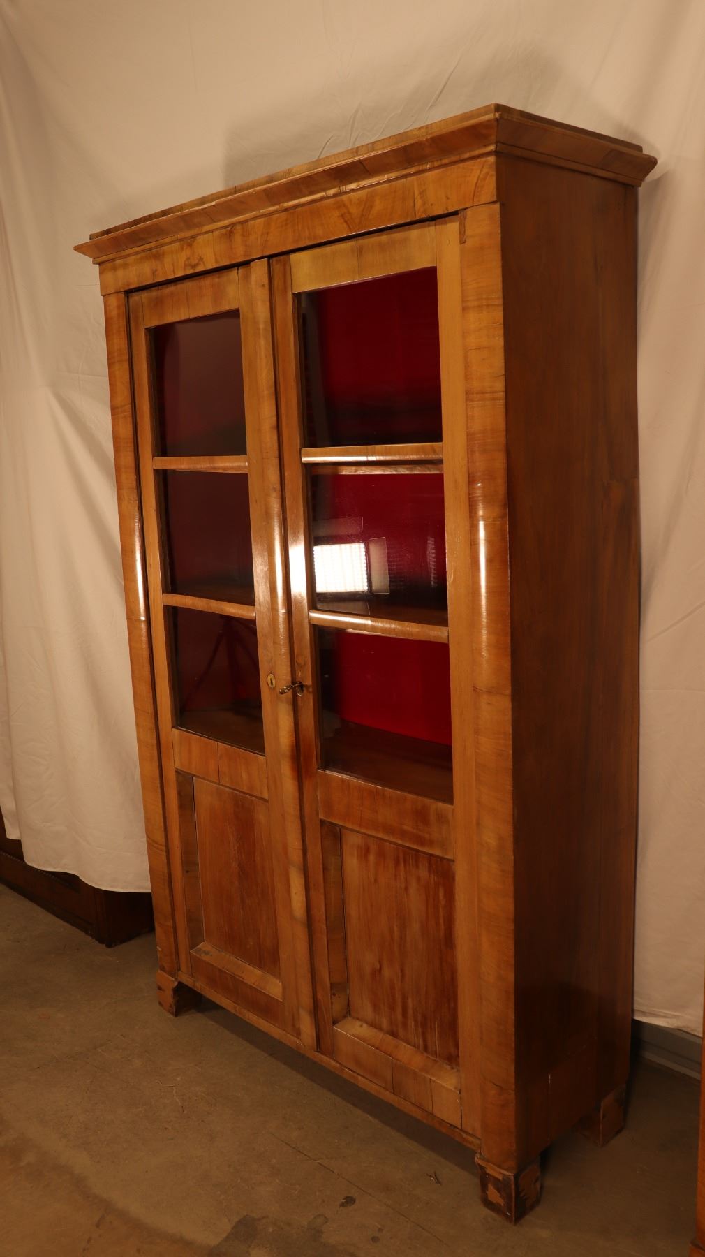 Central European Biedermeier vitrine or bookcase in figured walnut veneer, with glazed doors, shelved interior, and key and lock. Minor veneer losses and age-related surface wear noted. 46.5x17x72