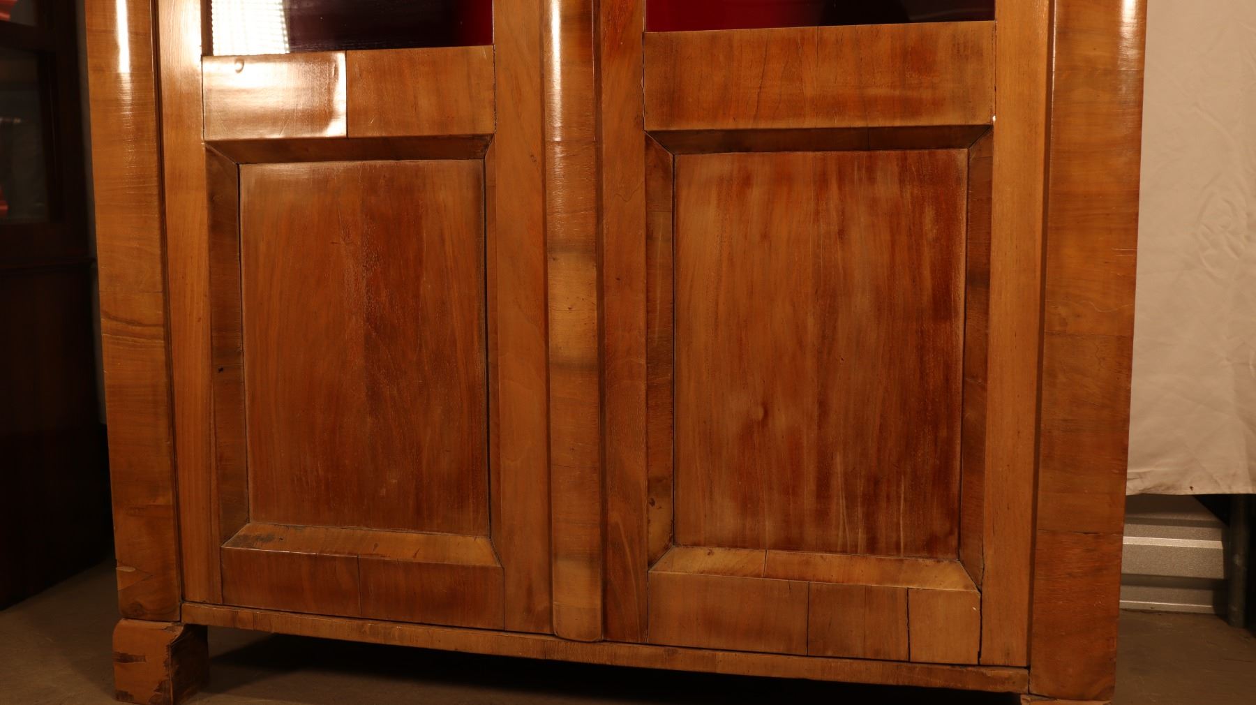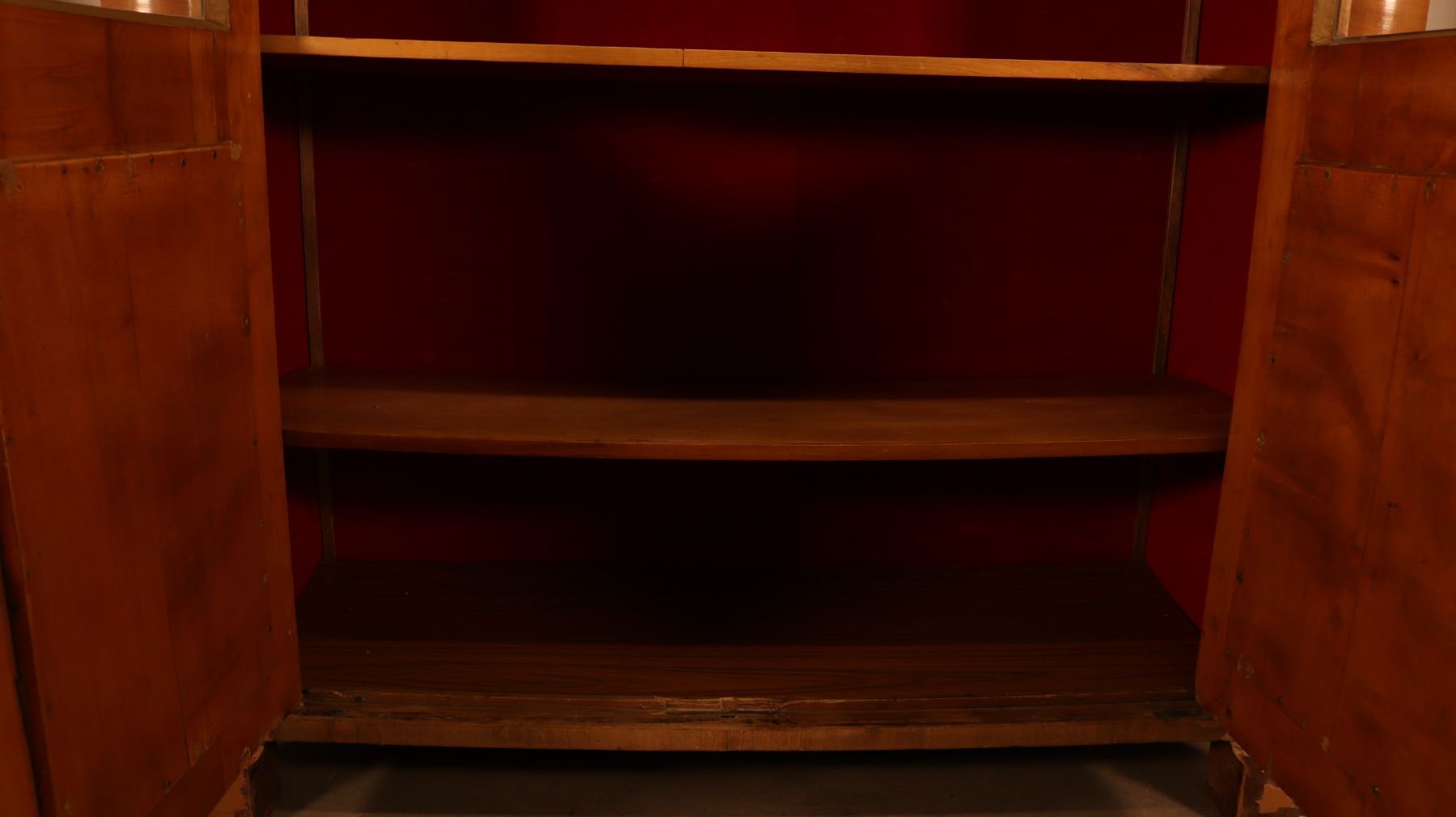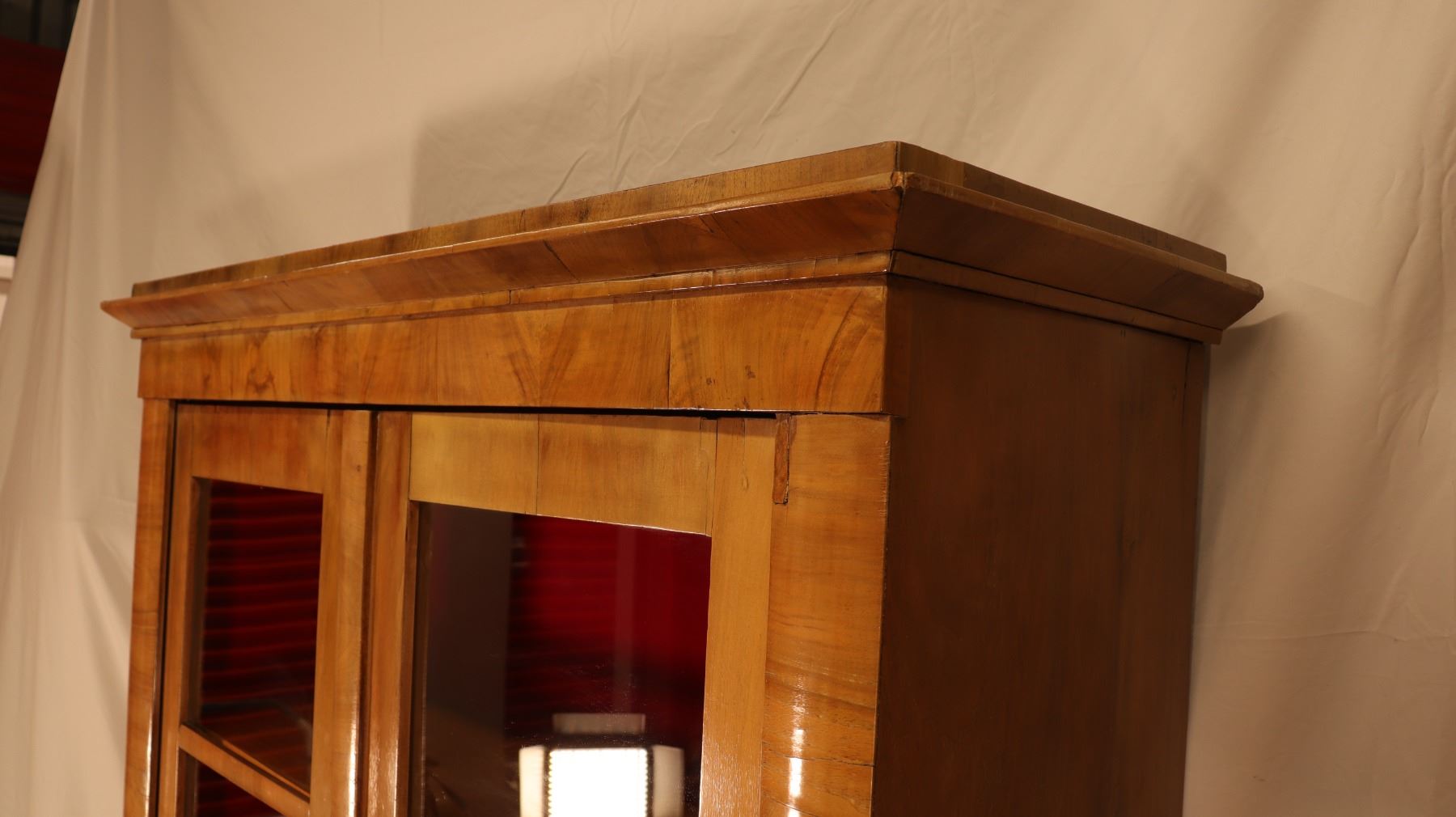Central European Biedermeier vitrine or bookcase in figured walnut veneer, with glazed doors, shelved interior, and key and lock. Minor veneer losses and age-related surface wear noted. 46.5x17x72