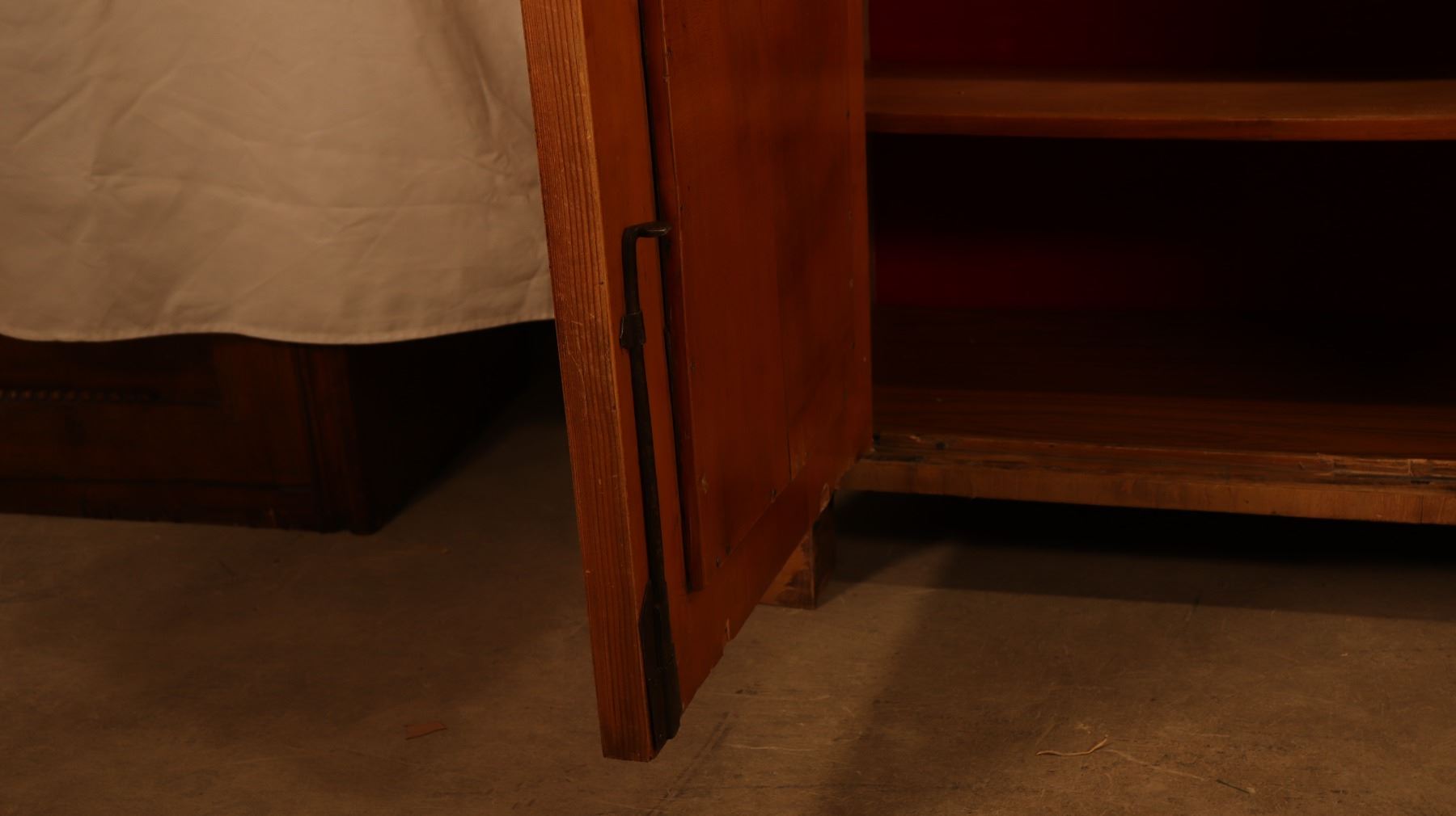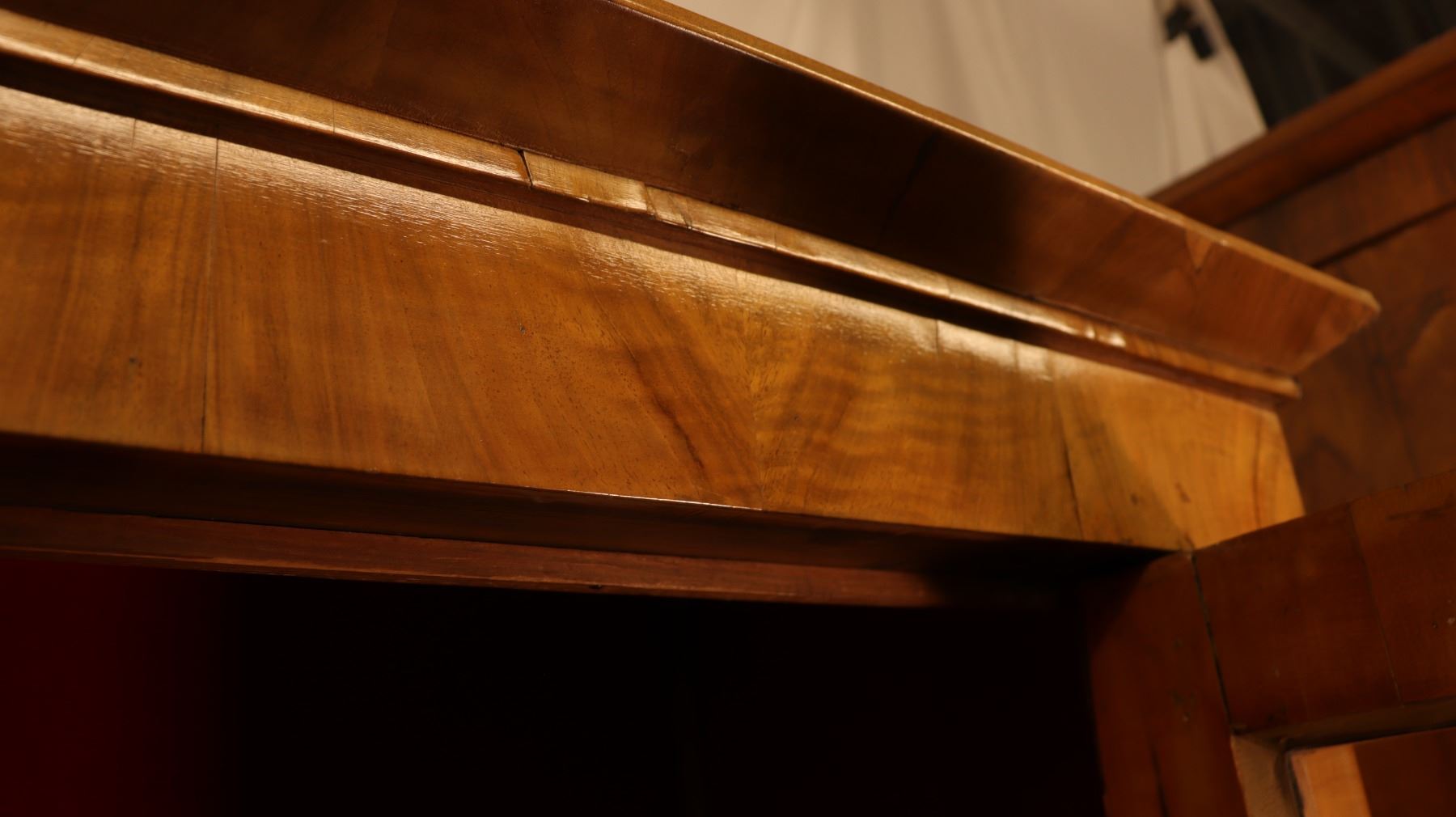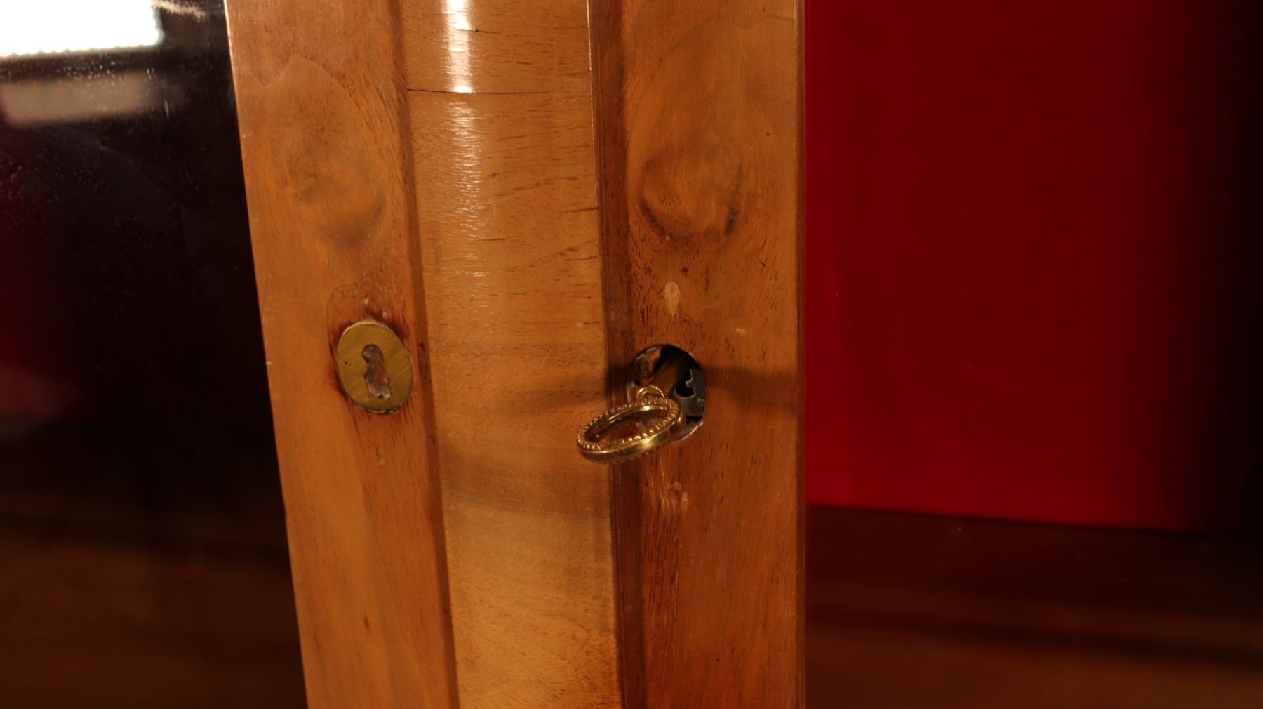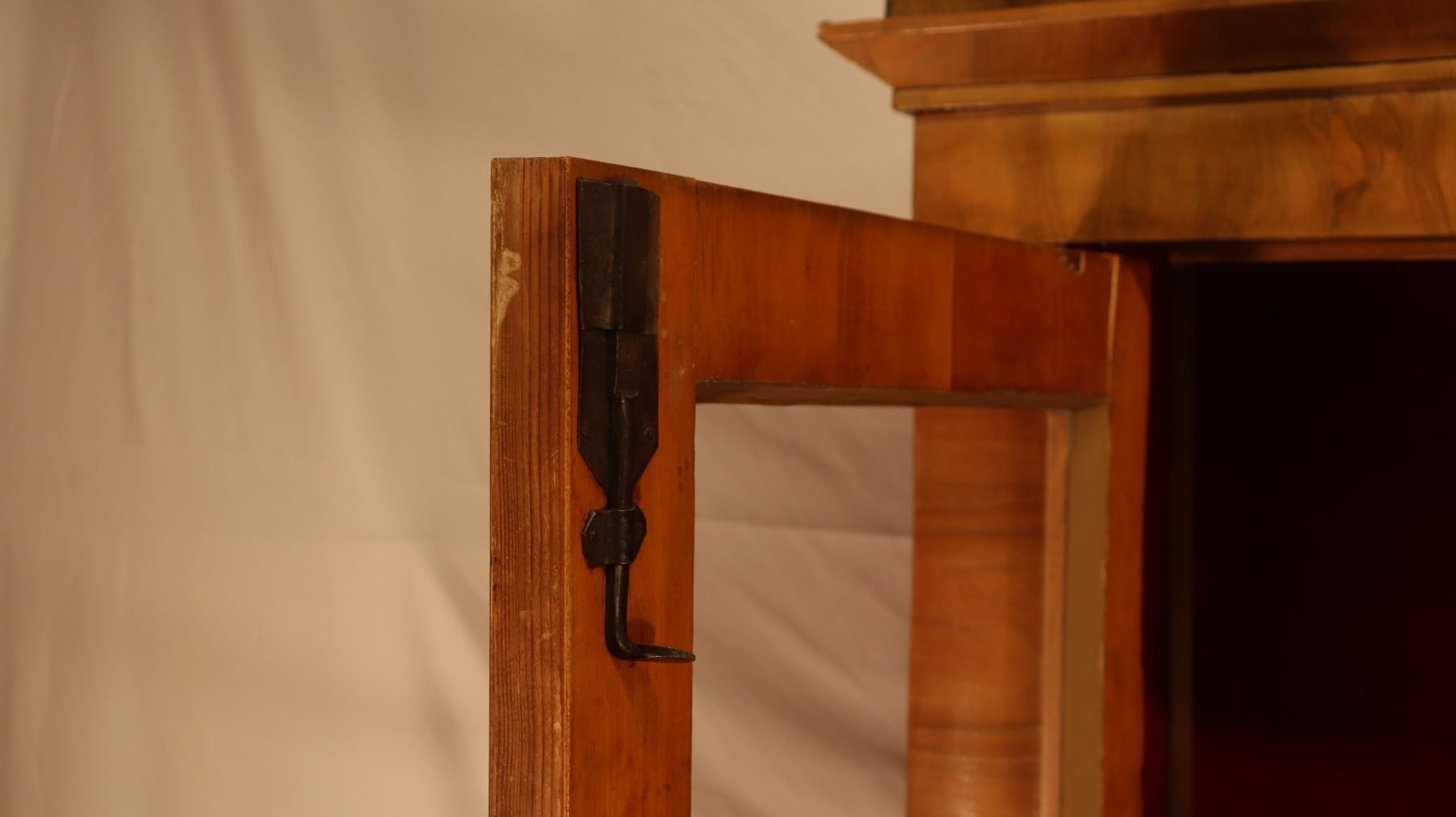 Central European Biedermeier vitrine or bookcase in figured walnut veneer, with glazed doors, shelved interior, and key and lock. Minor veneer losses and age-related surface wear noted. 46.5x17x72