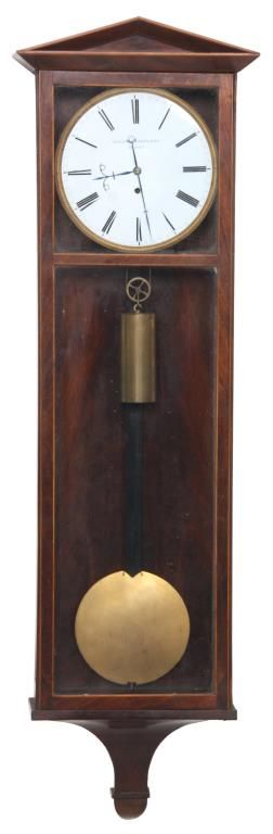 Biedermeier Weight Driven Hanging Regular Clock. 7 in. porcelain dial with black painted Roman hour numerals on the chapter ring, fancy blued hands, gilt bronze bezel, dial signed “Ernst Ferdinandi – In Wein”; has a mahogany seat board with an 8 day weight driven brass time only movement, deadbeat escapement, brass weight & pulley, brass covered pendulum bob swings on a long ebonized wood stick. In an inlaid mahogany lantern style case with original glasses and original finish. Movement is not running. 36 in. high x 10.5 in. wide x 4.5 in. deep.