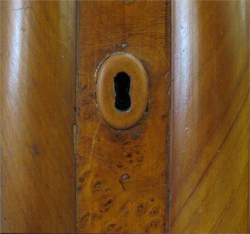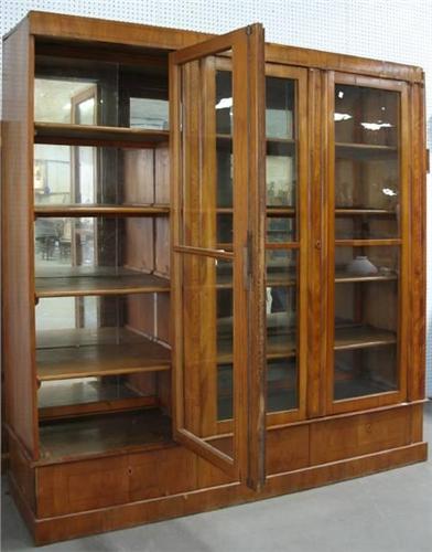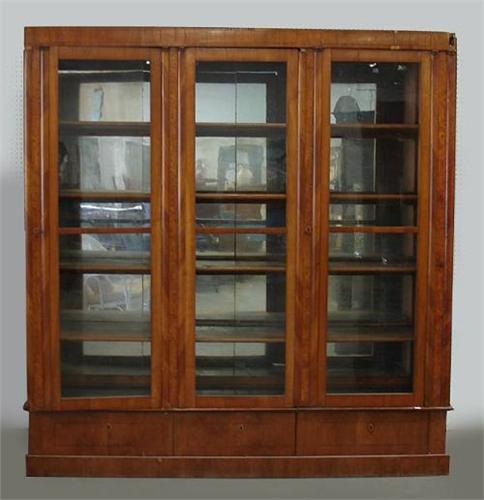 Biedermeier bookcase; cherry and burled walnut veneer; flat frieze with line inlay over three glass doors flanked by piers of half columns; on base; Austrian; C.1840; mirrored back; 80" high x 78" across x 21" deep; with appraisal (some loss to veneer and repair to top corner)