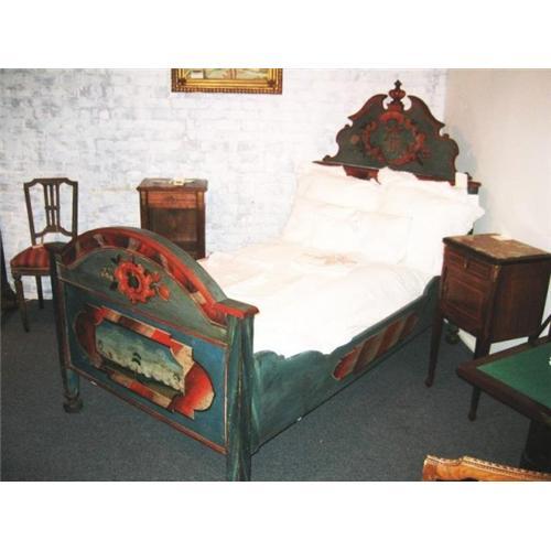 Is a beautiful painted Biedermeier Bed, made approx 1820-1830 in Germany in the Bavaria area,Has on top of the head piece a King Crown with the initial of the Son of the King.I both his bed by the Estate sale of the King of Sachsen for 30 years ago in Germany.The feet end of the bed has a front panel hand painted with a see batle a with boat very nice and fine painted Size: Head 61" H Feet:39" L 80" W:41" All sales are final No exchange, no credit, no return