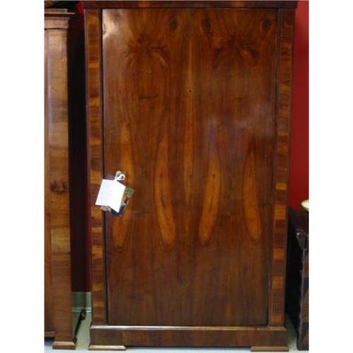 Single door Biedermeier Armoire, circa 1830, walnut veneer on pine from Vienna. This single door armoire was made for Herr F. Scheibel as his name is inscripted on the bottom of the item, as well as the port it was to enter into . It is rare to find the armoires with the single door intact as many were restructured with glass for diplay.