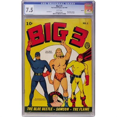 <B>Big 3 #1 Denver pedigree (Fox, 1940) CGC VF- 7.5 White pages.</B></I> Fox's "big three" -- Blue Beetle, Samson, and the Flame -- team up for this early anthology title. Alex Blum, best known for his <B>Classics Illustrated</B></I> work, is featured as a story artist. A great-looking copy, this one also boasts great interior page quality. Overstreet 2007 VF 8.0 value = $1,519. CGC census 6/07: 3 in 7.5, 4 higher.<BR><BR><b>Shipping:</b> Comics - Slabbed (certified) (<a target="_blank" href="http://www.heritageauctions.com/common/shipping.php">view shipping information</a>)