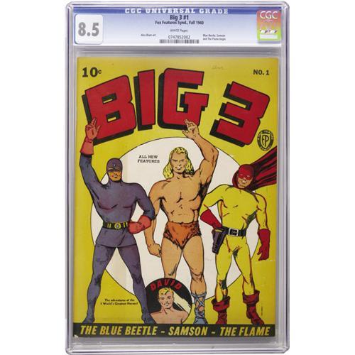 <B>Big 3 #1 (Fox, 1940) CGC VF+ 8.5 White pages.</B></I> Fox books in high grade are not a common sight, and this copy's got a pedigree-type look about it! The Blue Beetle, Samson, and the Flame are the big three in question. As of this writing, only the Mile High copy has been graded higher. Overstreet 2006 VF 8.0 value = $1,481; VF/NM 9.0 value = $2,341. CGC census 9/06: 1 in 8.5, 1 higher.<BR><BR><b>Shipping:</b> Slabbed Comic (<a target="_blank" href="http://www.heritageauctions.com/common/shipping.php">view shipping information</a>)