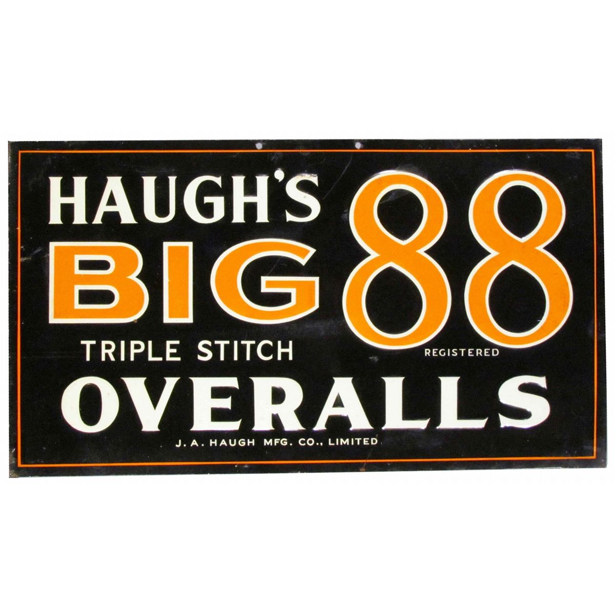 Big 88 Haugh's Overalls Tin Sign. J.A. Haugh Mfg. Co. Limited. Couple of minor creases and a scuff at 12:00 otherwise Very Good Condition. 17 3/4 X 10 inches.
