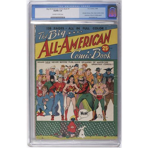 <B>Big All-American Comic Book #1 (DC, 1944) CGC VG/FN 5.0 Off-white to white pages.</B></I> Just listing the characters who appear in this 128-page tome would take up more space than we have available -- buying this for a quarter must have been a no-brainer! And today it's on Overstreet's list of the 100 most valuable Golden Age comics. Joe Kubert fans will want to note that this book has Kubert's first work on Hawkman. Overstreet 2006 VG 4.0 value = $1,854; FN 6.0 value = $2,781. CGC census 3/06: 1 in 5.0, 13 higher.