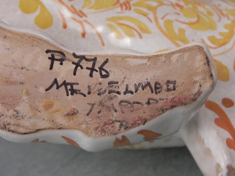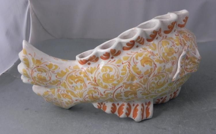 This ceramic fish sculpture is also a vase for flowers or dried flowers. The style has Asian influences, and the yellow and orange pattern on natural glazed surface enhances its look. * * * Artist: Signed on the bottom * Medium: Glazed porcelain * Dimensions: 15" long x 7" tall * Edition: Numbered P776. * Condition: Very good; a few chips to the tail fin