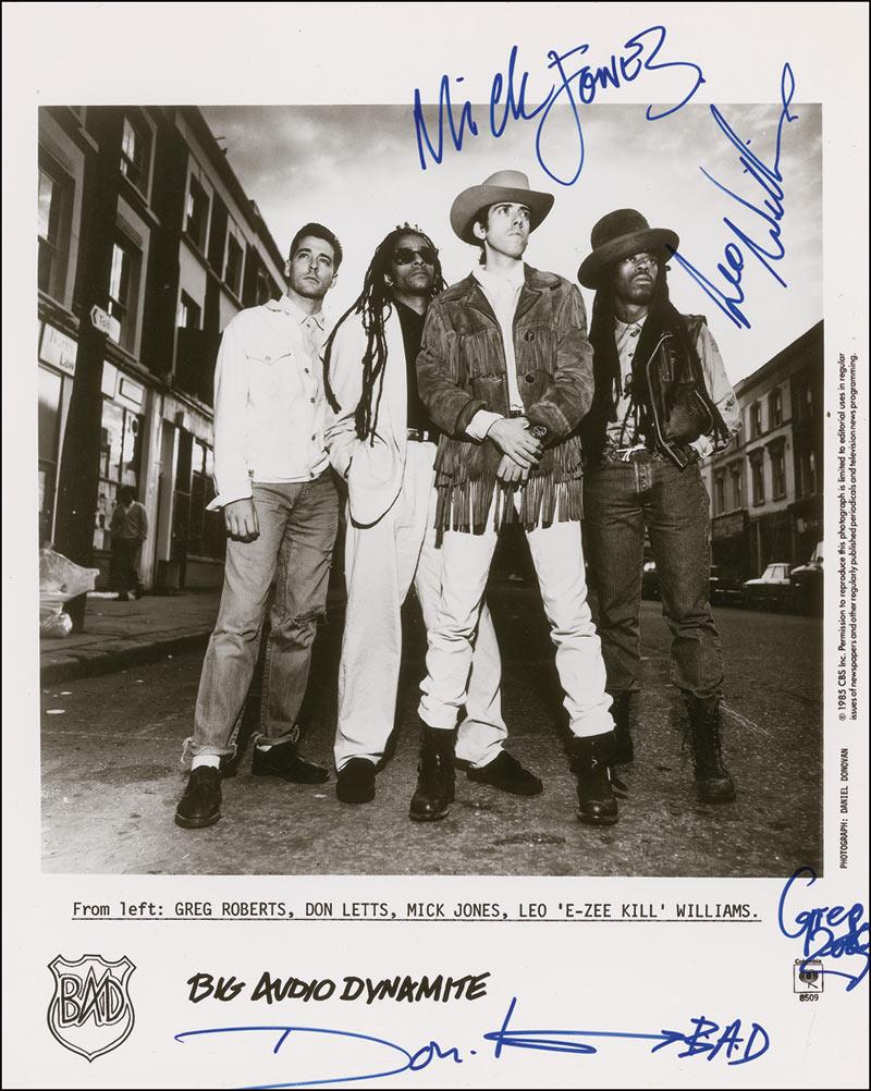 Glossy 8 x 10 Columbia publicity photo of the group, signed in blue felt tip by Greg Roberts, Don Letts, Mick Jones, and Leo Williams. In fine condition, with some scattered light surface marks and dings.