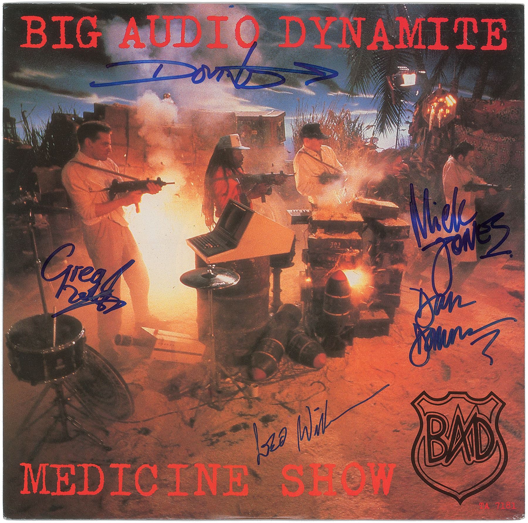 'Medicine Show / A Party' single album by Big Audio Dynamite, signed on the front cover in blue felt tip by Mick Jones, Don Letts, Dan Donovan, Leo Williams, and Greg Roberts. In fine condition. The record is included.