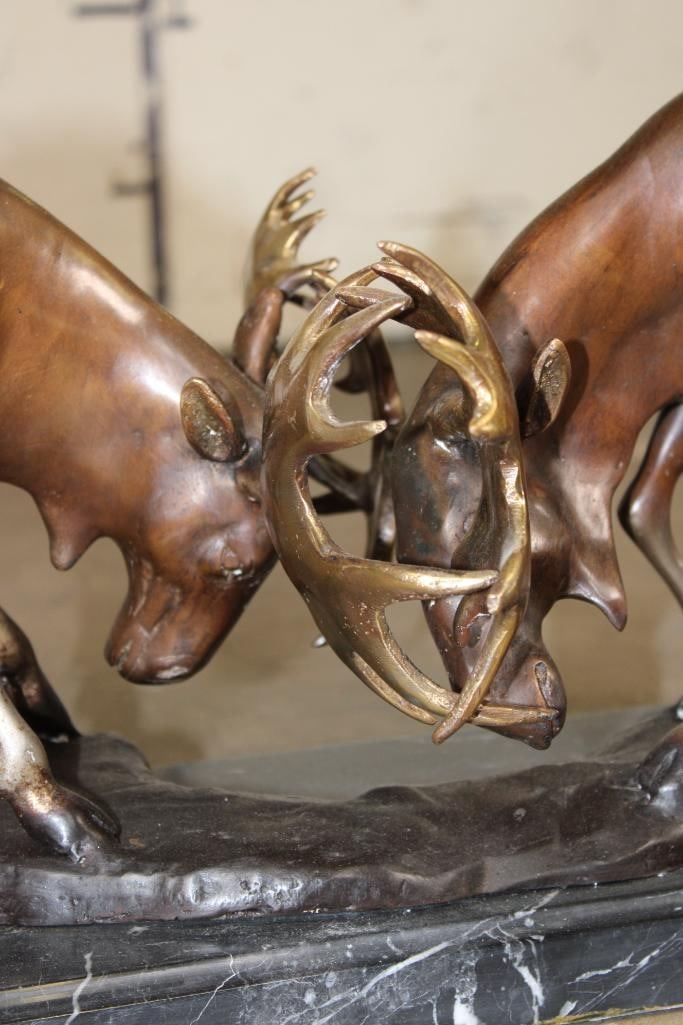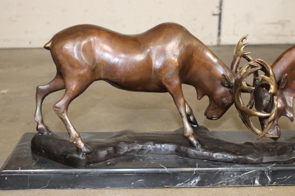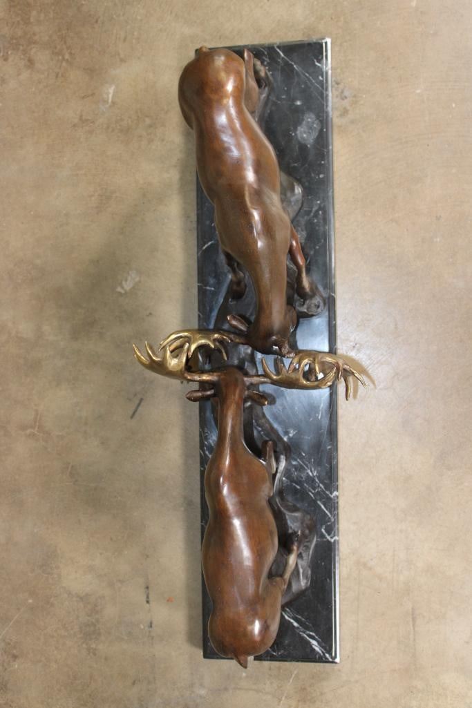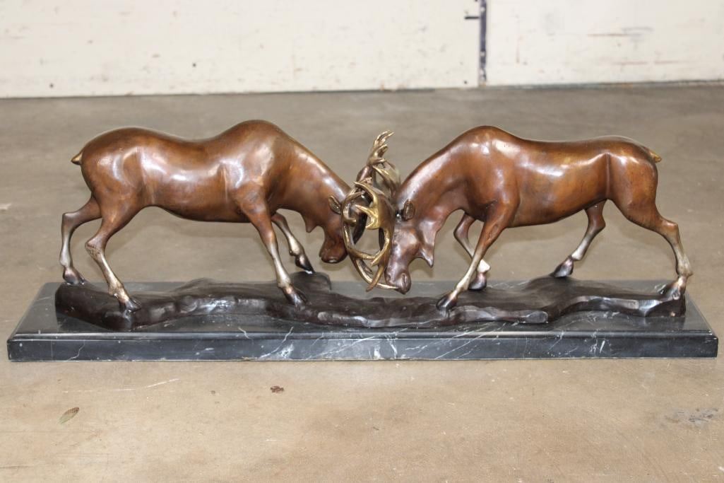 Big BRONZE Fighting MOOSE BULLS on a Marble Base. It measures 32" Long x 7" Wide x 10.5" Tall. The Total Weight is 48 lbs. COLLECTIBLE BRONZE ART SCULPTURES AND STATUES