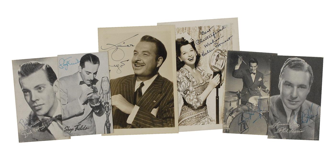 Six signed vintage photos, including four arcade cards, each signed in ink by the respective musician pictured. Signers are: Gene Krupa, Xavier Cugat, Helen Forrest, Shep Fields, Phil Harris, and Dick Haymes. In fine overall condition.