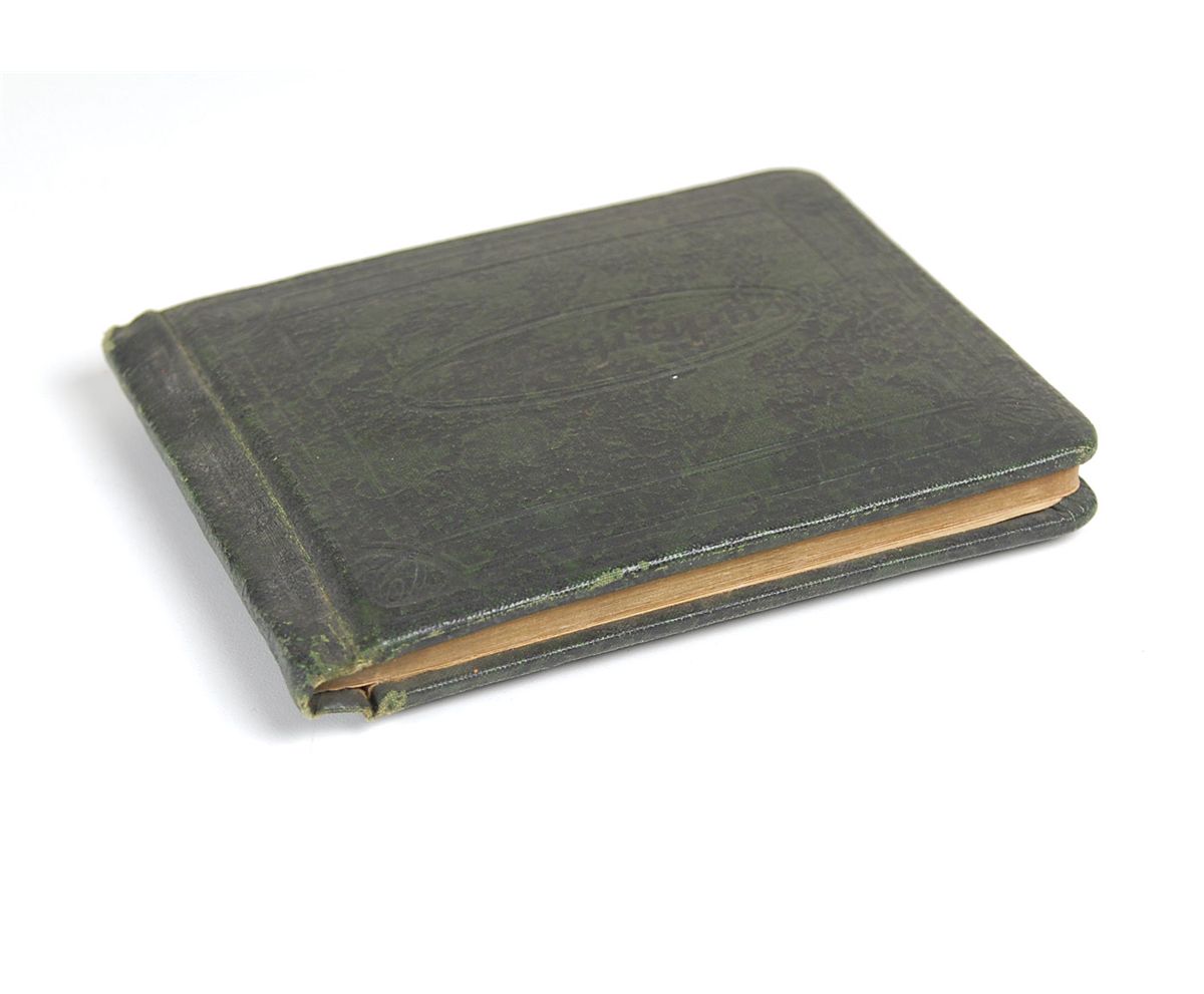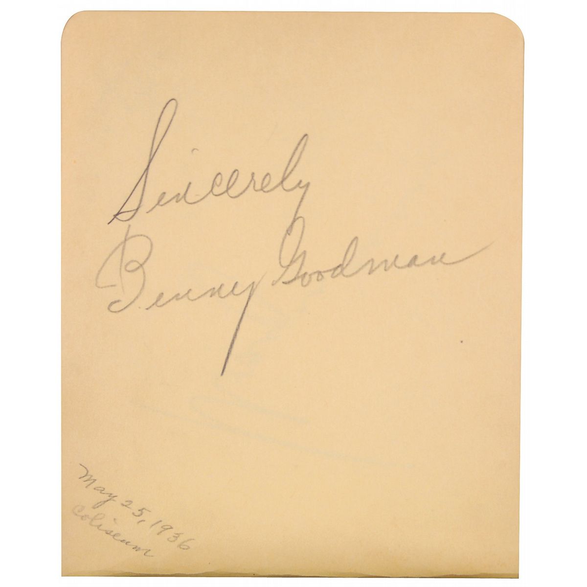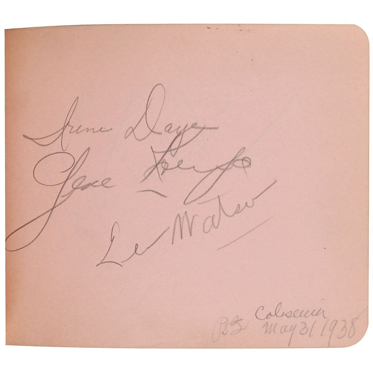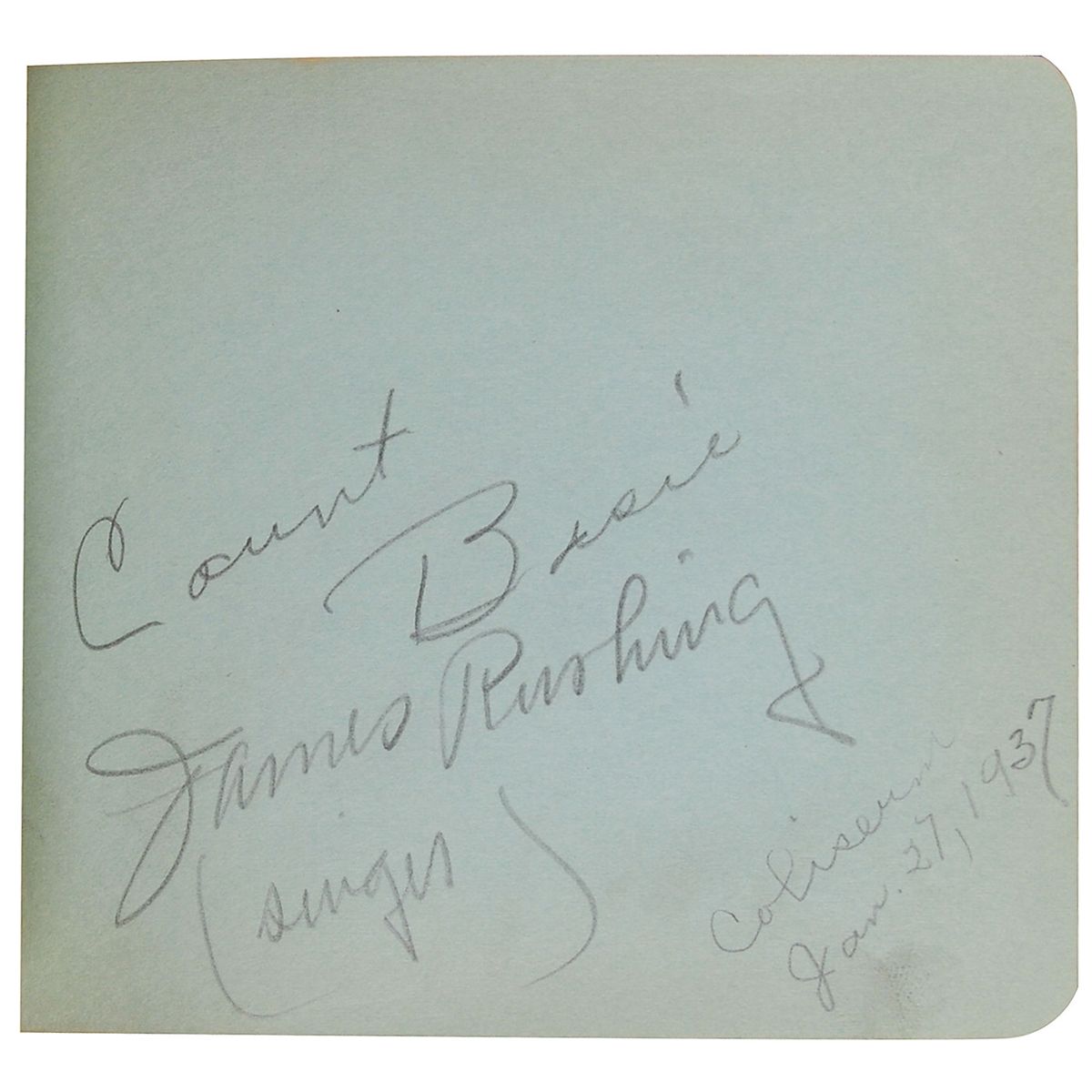 Hardcover autograph album, 6.25 x 4.75, signed inside in pencil by over 100 musicians, bandleaders, and others associated with ‘big band’ music, most dated between 1936 and 1938, including: Count Basie, Gene Krupa, Benny Goodman, Wayne King, Ted Lewis, Kenny Sargent, Jan Savitt, Elmo Tanner, Ted Weems, Bob Crosby, Noble Sissle, Irene Daye, Leo Watson, Red Nichols, Jimmy Rushing, Shep Fields, Barney Rapp, Sammy Kaye, Perry Como, Kay Kyser, Horace Heidt, The King Sisters, Little Jack Little, Jimmy Joy, and over 75 others. Scattered toning and soiling, otherwise fine condition.