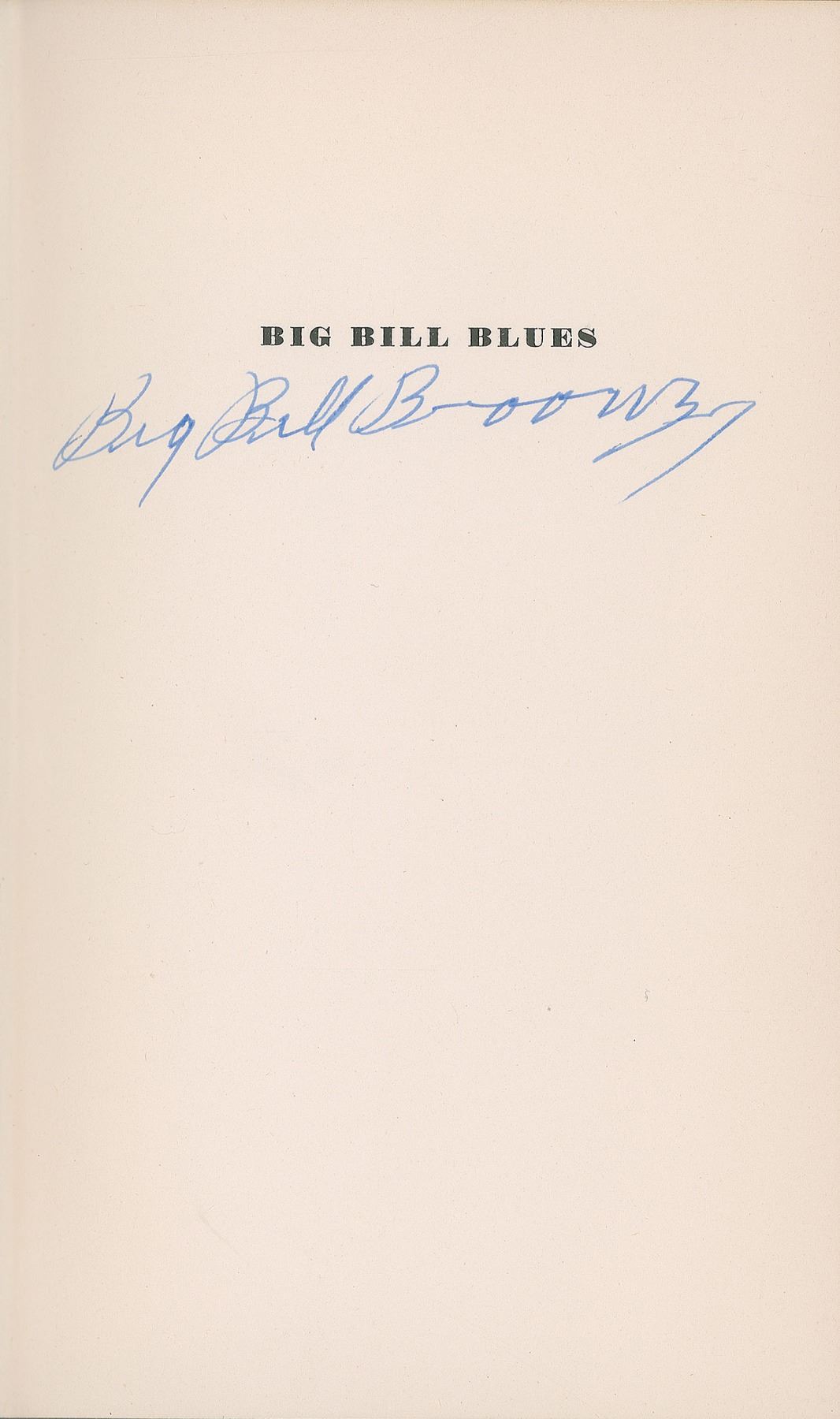 Signed book: Big Bill Blues: William Broonzy's Story. First edition. London: Cassell & Co., 1955. Hardcover, 5.5 x 8.75, 139 pages. Signed on the half-title page in fountain pen, "Big Bill Broonzy." In fine condition.