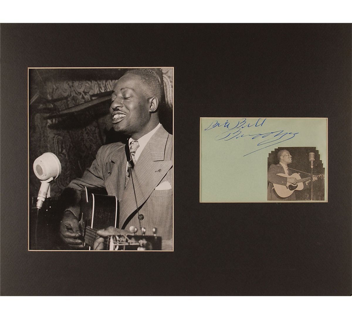 American blues singer, songwriter, and guitarist (1893–1958). Vintage fountain pen signature, “Big Bill Broonzy,” on a light green 6.5 x 4.25 album page bearing an affixed newspaper photo. Matted with a portrait of Broonzy playing his guitar to an overall size of 18 x 14. In fine condition.