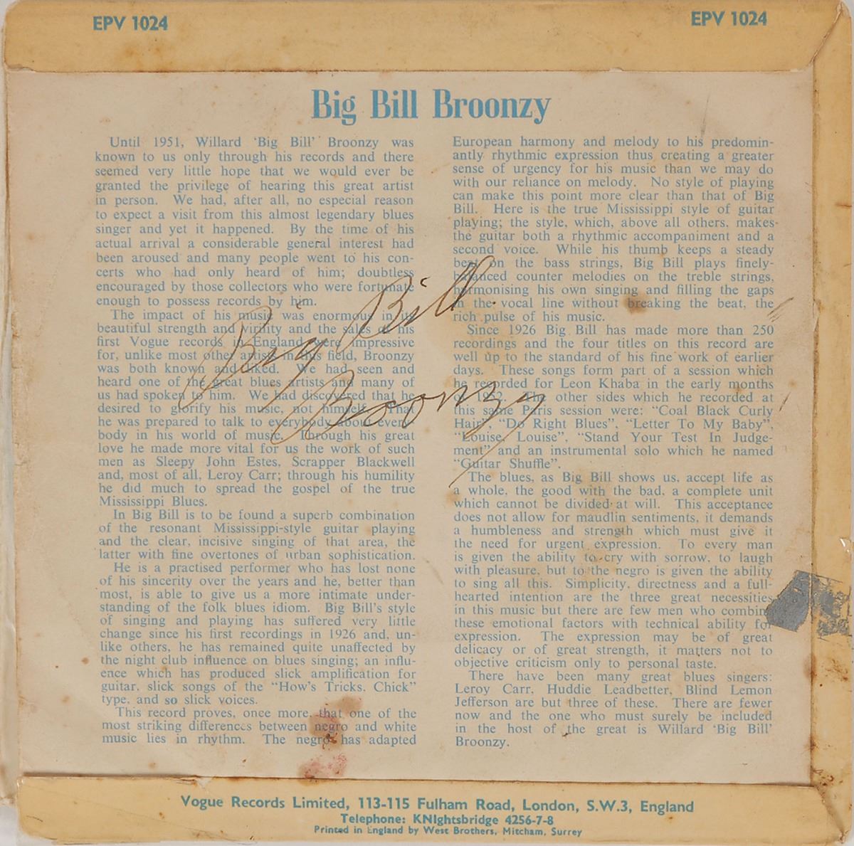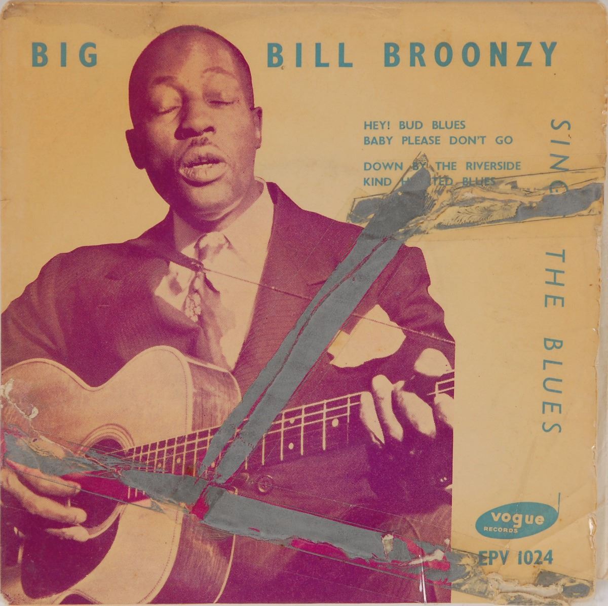 Vintage Vogue Records 45 rpm record of Big Bill Broonzy Sings the Blues, signed on the back cover in black ink. In very good condition, with some staining and wear to signed side, and extensive tape repairs to the image side. The record is included.