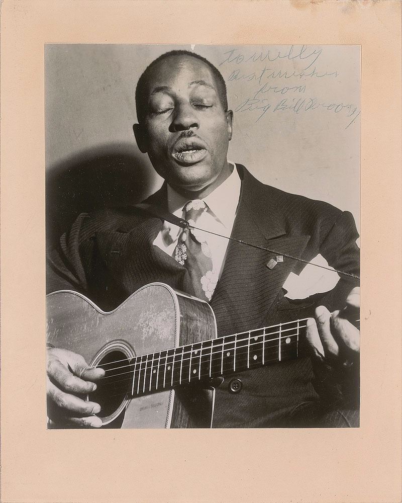American blues singer, songwriter and guitarist (1893–1958), who was one of the key figures in the development of blues music in the 20th century; he became an international star in the 1950s when he returned to his traditional folk-blues roots and became one of the leading figures of the emerging American folk music revival. Very rare vintage glossy 7.5 x 9 half-length photo of Broonzy playing his guitar, signed and inscribed in black ballpoint ,"To Willy, Best wishes, from, Big Bill Broonzy.” Affixed to an off-white 9.5 x 11.75 sheet. In fine condition, with a light paperclip impression to the left edge, and a bit of ink adhesion trouble to the end of the signature. Broonzy remains rare across all signed formats, with this being just the second photo we have ever offered, and easily the most impressive.