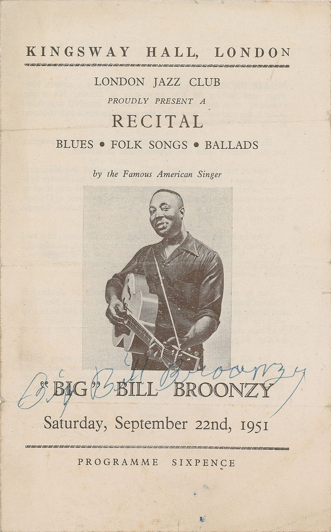 Vintage program for a recital by 'Big' Bill Broonzy at the London Jazz Club on September 22, 1951, 5 x 8, signed on the front in black ink. In very good condition, with creasing, three horizontal folds, and pencil notations inside, presumably from the concert-goer.