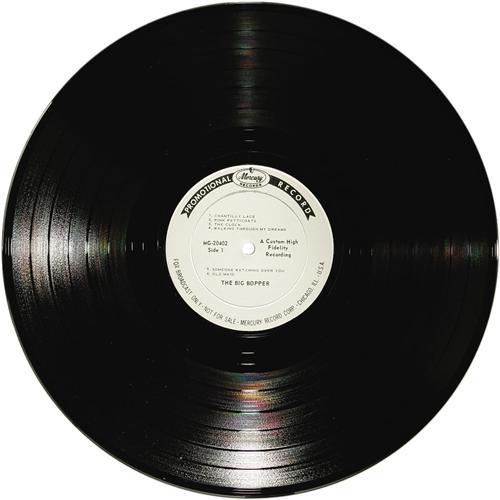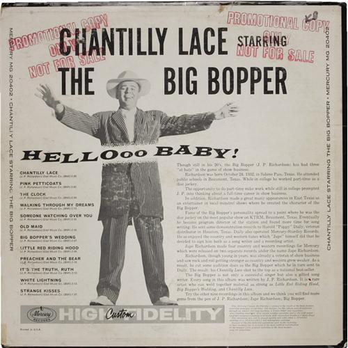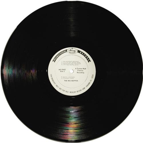 <B>Big Bopper "Chantilly Lace" Promo LP (Mercury 20402, 1956).</B></I> The Bopper's only album is a nifty collector's item, and especially so when the copy's a promo! Here's a white label record, with "PROMOTIONAL COPY ONLY NOT FOR SALE" stamped twice on the back album cover. On the front cover, there's a 1/4 inch line along the right edge from top to bottom which didn't get laminated, but it's a nice copy. And the record is even nicer. Condition: EX 7/ NM 8. <I>From the GRT Collection.</B></I><BR><BR><b>Shipping:</b> Recordings (<a target="_blank" href="http://www.heritageauctions.com/common/shipping.php">view shipping information</a>)