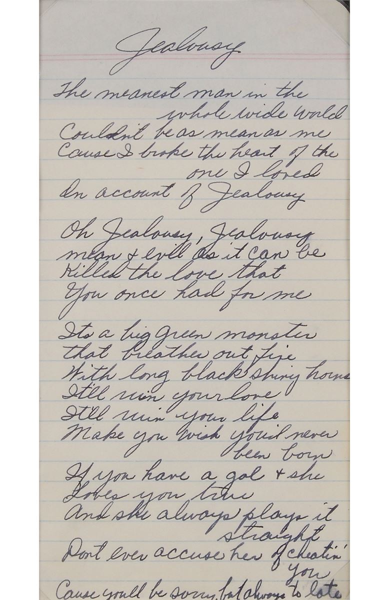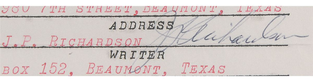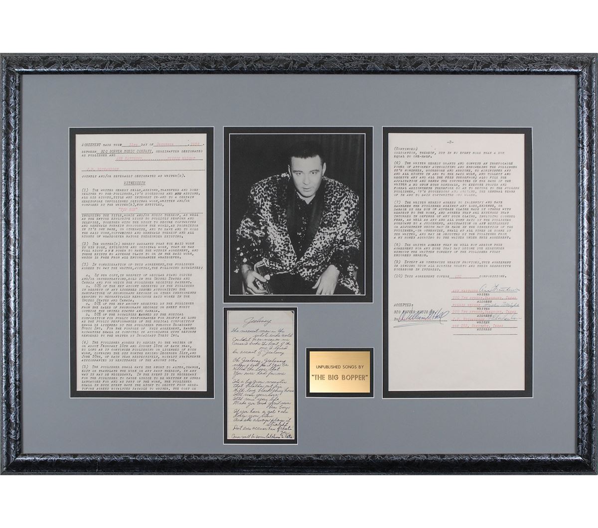 Stage name of J. P. Richardson (1930–1959) whose big voice and exuberant personality made him an early rock and roll star. He tragically died in a plane crash along with fellow musicians Buddy Holly and Ritchie Valens. Two outstanding items: a DS, signed “J. P. Richardson,” two pages, 6.75 x 13.25, December 11, 1958. An agreement between the Big Bopper Music Company and Ann Matthews, Millie Wright, and J. P. Richardson, transferring the publishing rights to an “unpublished original work…now entitled, ‘Top Gun.’” Signed at the conclusion in ballpoint by Matthews, Wright, and Richardson, and countersigned by William G. Hall of the Big Bopper Music Company; and handwritten lyrics, unsigned, one lined page, 3.25 x 6.5, no date. The Big Bopper pens the lyrics to an apparently unpublished song entitled “Jealousy.” In part (spelling and grammar retained): “The meanest man in the whole wide world / Couldn’t be as mean as me / Cause I broke the heart of the one I loved / On account of Jealousy.” Double-matted and framed together with a photo and nameplate to an overall size of 31 x 22. In overall fine condition. The ‘day the music died’—Big Bopper’s fatal crash—came on February 3, 1959, less than two months after signing this document. It seems that neither ‘Top Gun’ nor ‘Jealousy’ were ever recorded. A poignant reminder of what could have been. Accompanied by a full letter of authenticity from PSA/DNA and a full letter of authenticity from Roger Epperson/REAL. The James Collings Collection.