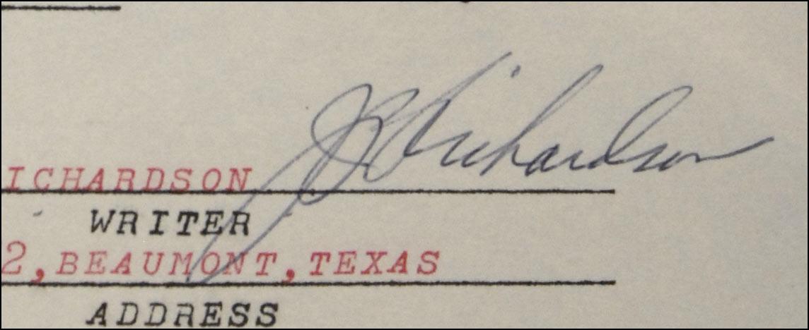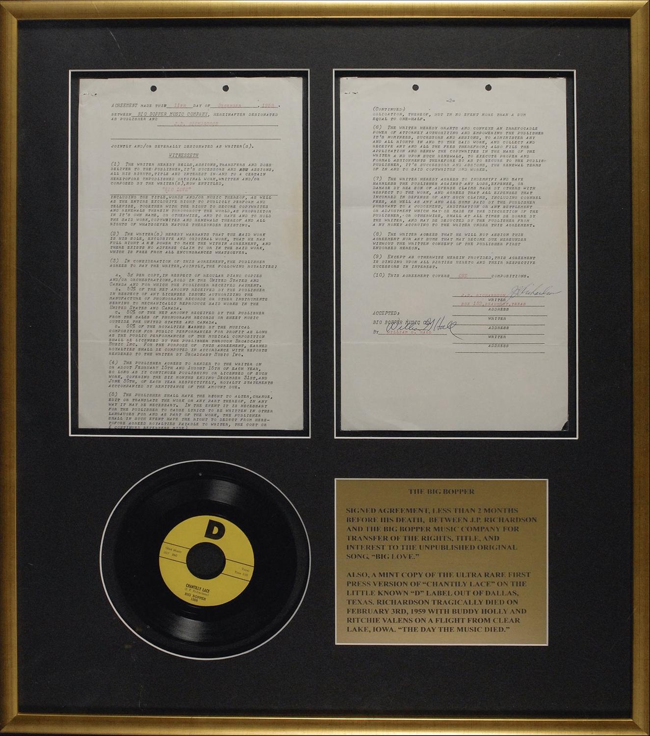 Real name J. P. Richardson. Best known for the song ‘Chantilly Lace,’ The Big Bopper was killed in a plane crash along with Buddy Holly and Ritchie Valens on the morning on February 3, 1959. DS, signed “J. P. Richardson,” two pages, 8.5 x 14, December 11, 1958. Agreement between Richardson and the Big Bopper Music Company for the transfer of the rights, titles, and interest to the unpublished original song ‘Big Love.’ Richardson will receive three cents per copy of regular piano copies or orchestration sold in the US, 50% of the licensing, 50% of the record sales in the US and Canada, and 50% earned for public performances. Signed on the second page by Richardson, and also signed by William G. Hall as representative for the Big Bopper Music Company. Removably matted by its corner tips, and framed along with a mint copy of the ultra rare first press version of ‘Chantilly Lace’ on the little known “D” label out of Dallas, Texas, to an overall size of 24.5 x 29. In fine condition, with punch and staple holes to top, as well as a light paperclip impression to top edge, expected folds, and some mild toning to right edge of both sheets. Just a month later, the ‘Bopper’ would embark on the 1959 Winter Dance Party. Oversized.