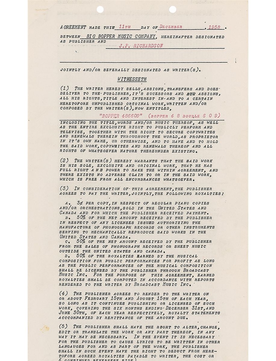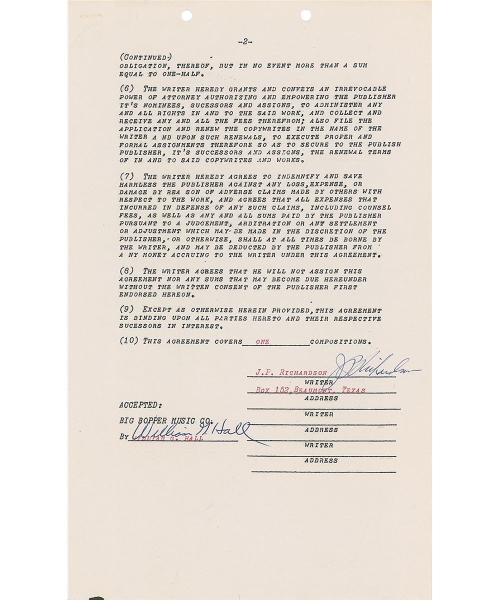 DS, signed “J. P. Richardson,” two pages, 8.5 x 14, December 11, 1958. An agreement between Richardson and his Big Bopper Music Company for the sale of his composition entitled ‘Bopper 486609 (Bopper 48 Double 609),’ with Richardson receiving three cents per copy of piano and orchestration music, and 50% of record sales, music sales outside of the United States, and public performances. Signed on the second page in blue ballpoint by Richardson. Also signed by William G. Hall as representative for the Big Bopper Music Company. In fine condition, with punch holes and a staple hole to top edge.