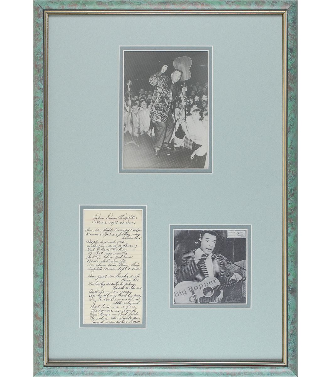 Stage name of J. P. Richardson (1930–1959) whose big voice and exuberant personality made him an early rock and roll star. He tragically died in a plane crash along with fellow musicians Buddy Holly and Ritchie Valens. Handwritten lyrics, unsigned, one lined page, 3.25 x 6.5, no date. The Big Bopper pens the lyrics to an apparently unpublished song entitled “Dim Dim Lights, (Music Soft & Slow).” In part (spelling and grammar retained): “Dim, Dim Lights Music soft & slow / Memories got me felling [sic] way down low / People around me / a laughin and a dancing / But I keep thinking / of Past romancing.” Handsomely double-matted and framed with two images to an overall size of 15.25 x 22. In fine condition. Although this song went unrecorded, it was probably inspired by—or served as the inspiration for—early rock and roller Bill Haley’s 1955 hit, ‘Dim, Dim the Lights, (I Want Some Atmosphere).’ A very bold, clean example of the Big Bopper’s songwriting talents. Accompanied by a full letter of authenticity from PSA/DNA and a full letter of authenticity from REAL. The James Collings Collection.