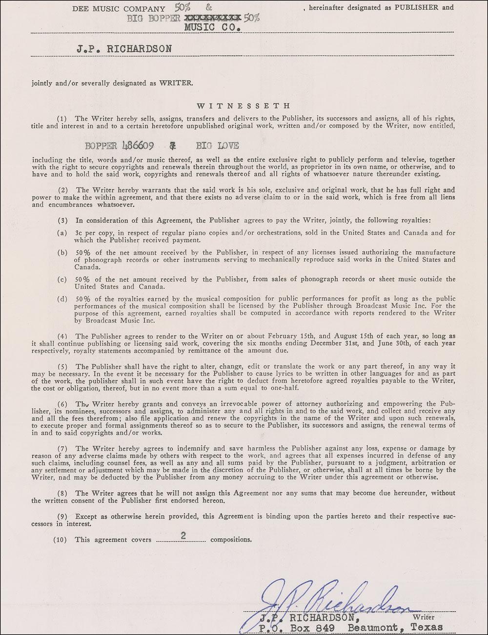 Real name J. P. Richardson. Best known for the song ‘Chantilly Lace,’ The Big Bopper was killed in a plane crash along with Buddy Holly and Ritchie Valens on the morning on February 3, 1959. Partial self-contained DS, signed “J. P. Richardson,” one page, 7.75 x 10, no date. An agreement between Richardson and his Big Bopper Music Company for the sale of his compositions entitled “Bopper 486609 & Big Love,” with Richardson receiving three cents per copy of piano and orchestration music, and 50% of record sales, music sales outside of the United States, and public performances. In fine condition, with trimmed edges, and two light horizontal folds through signature. Richardson is a difficult signature to obtain in any format due to his untimely demise.
