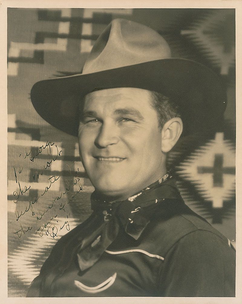 Vintage matte-finish 8 x 10 photo of Williams in western garb, signed and inscribed to assistant director George Rhein in fountain pen “To George, The most desperate of the ‘despardos,’ your friend, ‘Big.’” In fine condition, with trivial pinhole top top left corner, portions of writing light but legible, and tape remnants from scrapbook removal on the reverse.