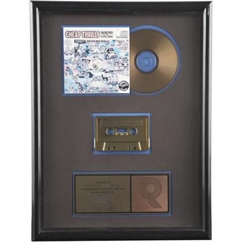 <B>Big Brother And The Holding Company "Cheap Thrills" RIAA Gold CD Award.</B></I> A gold sales award presented to Record & Tape Traders to commemorate the sale of more that 500,000 cassette and CD copies of <I>Cheap Thrills.</B></I> Framed to an overall size of 13" x 17" and in Excellent condition.<BR><BR><b>Shipping:</b> Framed - with Glass, Small (<a target="_blank" href="http://www.heritageauctions.com/common/shipping.php">view shipping information</a>)