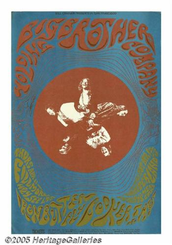 <B>Big Brother and the Holding Company Fillmore/Winterland Poster #BG115 4/11-13/68 (Bill Graham, 1968)</B></I> Unlike many of the Big Brother concert posters, this one actually features a photo of the group, including singer <I>extraordinare</B></I> Janis Joplin. Also featured were Iron Butterfly and Booker T. and the MGs, for one heck of a memorable show, at either the Fillmore or Winterland. The poster measures 14" x 21" and is in great shape save for a few wrinkles at the corners. VG+.