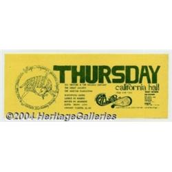 Big Brother and the Holding Company - Music Memorabilia Handbill (SF Calliope Co, 1966). A rare rectangular shaped handbill for an event called "Bilbo's Birthday Party." Besides Big Brother, this event also featured the Great Society, and the Amazing Charlatans. The handbill was only printed once, and there is no known poster, so this is a truly unique piece that you won't want to miss out on! The size of this piece is 4.5" x 11". Important notice: Heritage usually auctions material at the rate of 200-250 lots per hour. On some occasions eBay Live bid software or the Internet may not be able to keep up with the pace of the auction. We recommend placing a realistic absentee bid now as insurance to avoid disappointment. Occasionally the auctioneer may eliminate or reject an eBay Live bid, and the auctioneer may also reopen a lot after the close of the eBay live bidding (usually because we missed an audience bid), and may reject your bid even if it shows you as the winning bidder. By bidding via eBay Live, you agree that Heritage may award the lot to another bidder at its sole discretion under the circumstances described above or any other reasonable circumstances. Since eBay bids are not shown to us until we open the lot on the floor, we treat those bids just like floor bids. In most cases the floor responds before the eBay bid is presented to us, due to Internet lag time, so for consistency we have made it a policy that floor bids are always considered first over tie eBay live bids. Also please note that all Heritage lots purchased through eBay Live carry a 20% Buyer's Premium. Please make sure you read the Terms and Conditions before you bid.