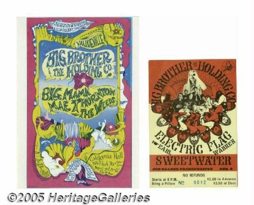 <B>Big Brother and the Holding Company Postcard and Ticket Group (Various).</B></I> Two tough to find items featuring Janis Joplin and Big Brother and the Holding Company. The first is a handbill from California Hall in San Francisco. Joining them was Big Mama Mae Thornton and Green Joynt Project. The second item is an unused large ticket from the Earl Warren Fairgrounds in LA.