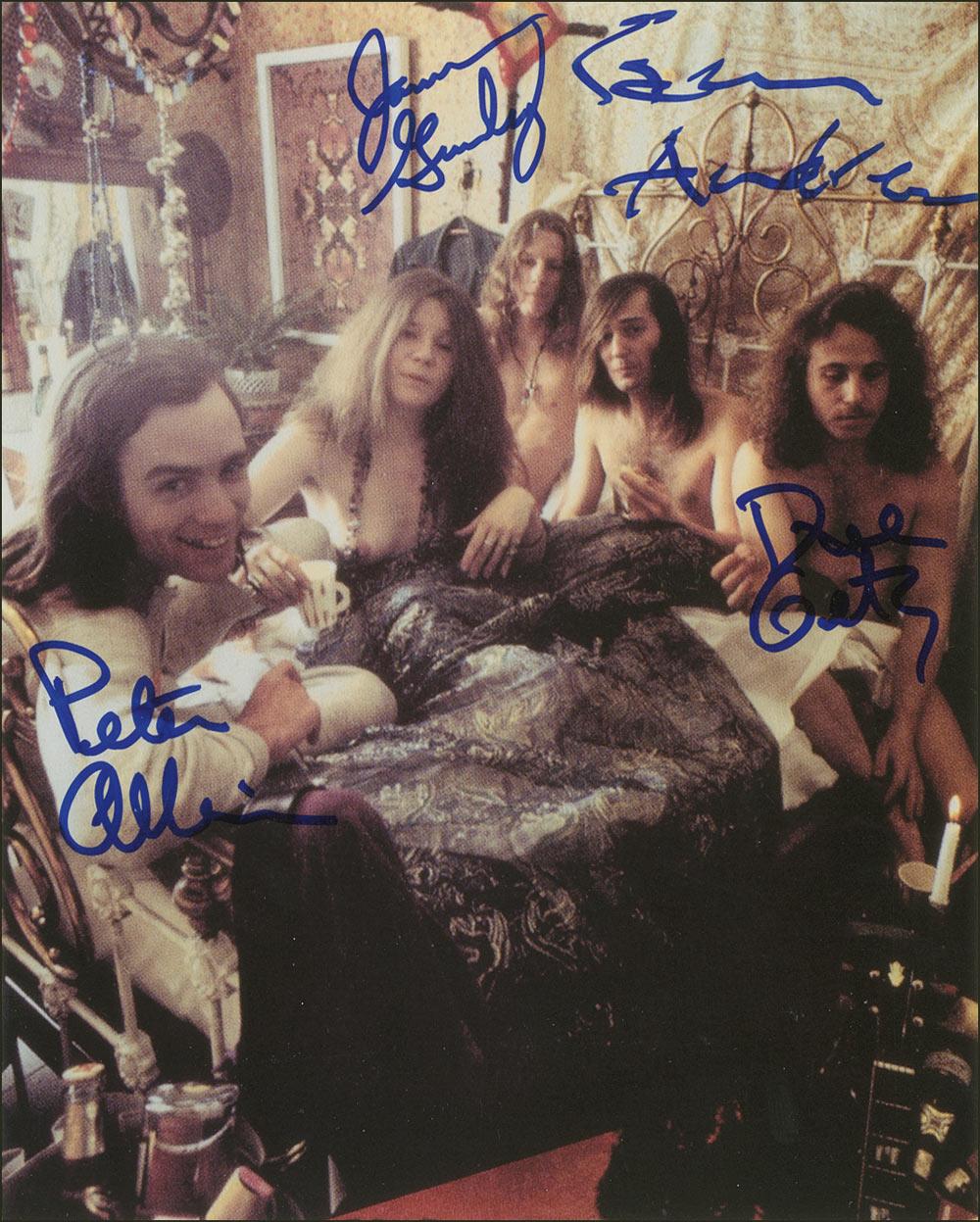 Color satin-finish 8 x 10 photo of the band posing in bed with a topless Janis Joplin, signed in blue felt tip by Sam Andrew, James Gurley, Peter Albin, and Dave Getz. In very fine condition.