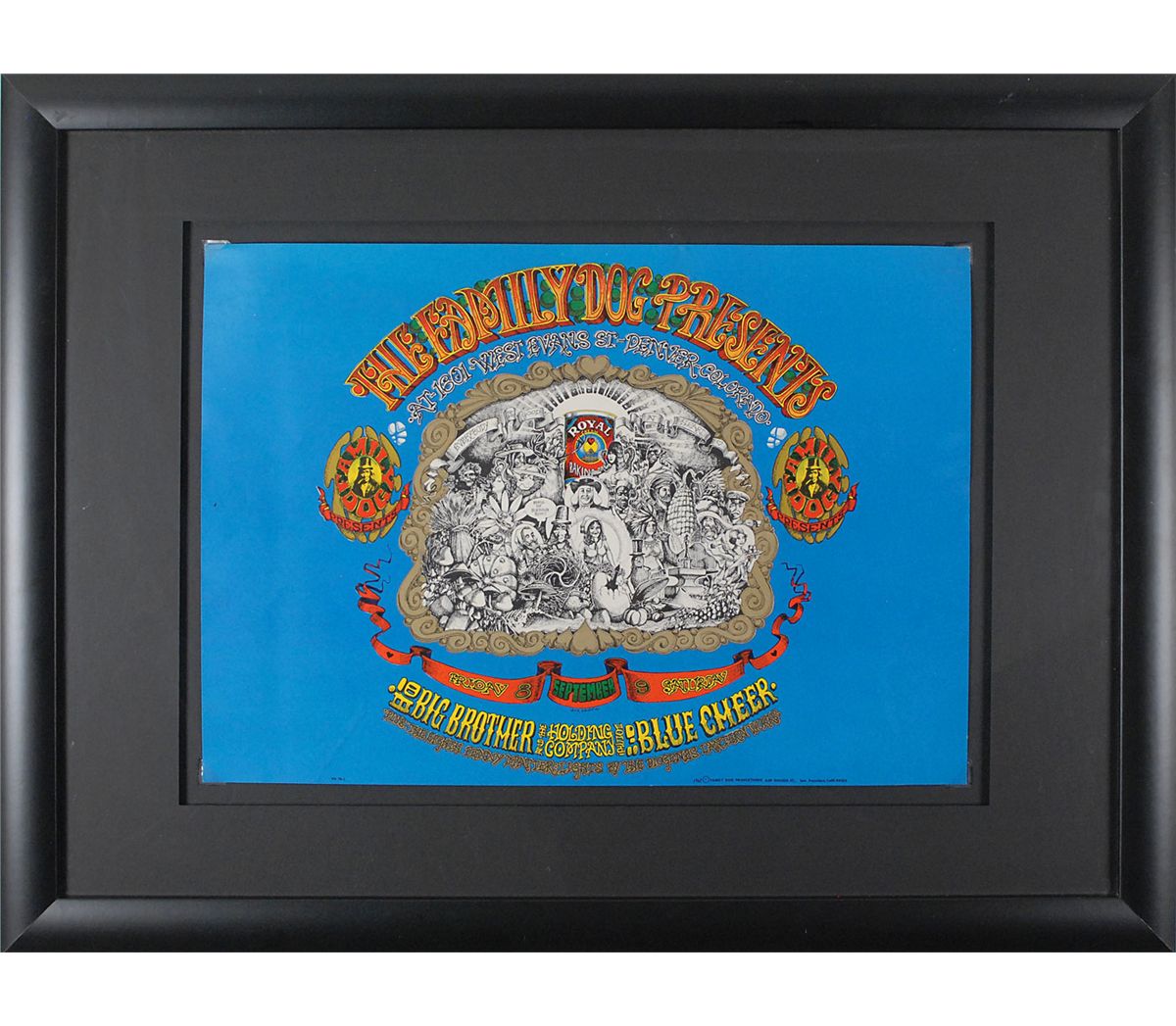 Original color 19.75 x 13.75 Family Dog concert poster for Big Brother and the Holding Company’s shows in Denver, Colorado, on September 8 and 9, 1967. Poster features artwork by Rick Griffin artwork featuring cartoon images of well-known icons including Mr. Peanut, Uncle Ben, and Smokey Bear, and is numbered 79-1 at the bottom. Matted and framed to an overall size of 30.5 x 23. In fine condition.