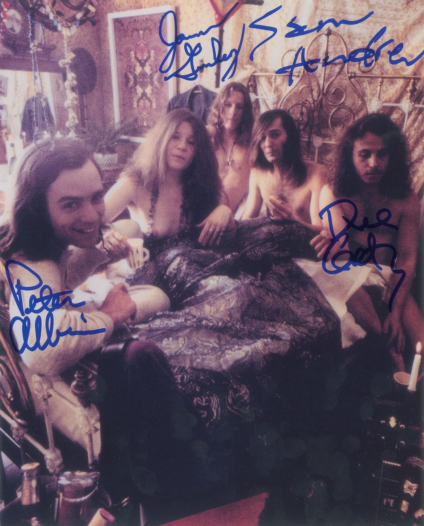 Glossy 8 x 10 photo of Big Brother and the Holding Company relaxing nude in a bed together, signed in blue felt tip by Sam Andrew, James Gurley, Peter Albin, and Dave Getz. In very fine condition.