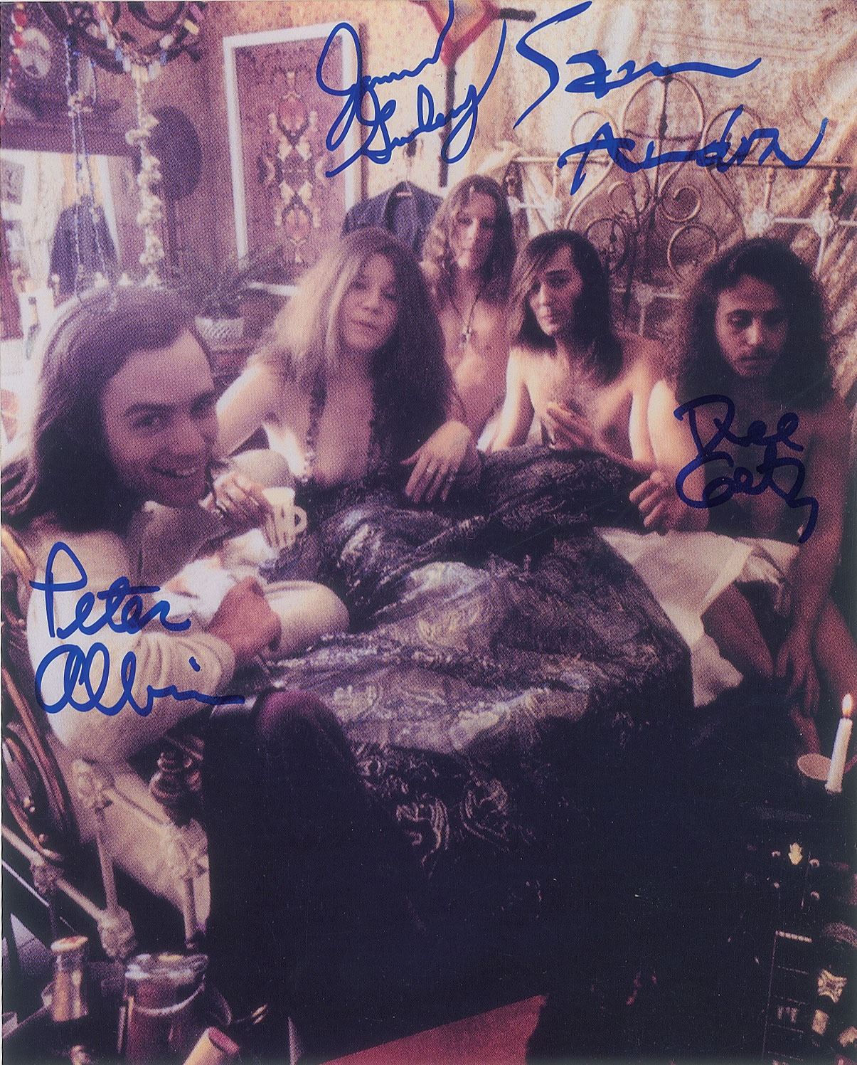 Glossy 8 x 10 photo of Big Brother and the Holding Company relaxing nude in a bed together, signed in blue felt tip by Sam Andrew, James Gurley, Peter Albin, and Dave Getz. In very fine condition.