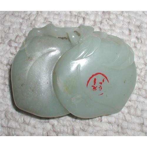 Very nicely carved antique 19th C. large Chinese celadon nephrite jade peach group with vine. Very fine carving. The red paint mark is originally stamped by the Chinese government for export permit. Circa 19th C. or earlier with celadon color. There is a natural tissue line in the stone. Size: 3 inches long, and 2 5/8 inches wide.