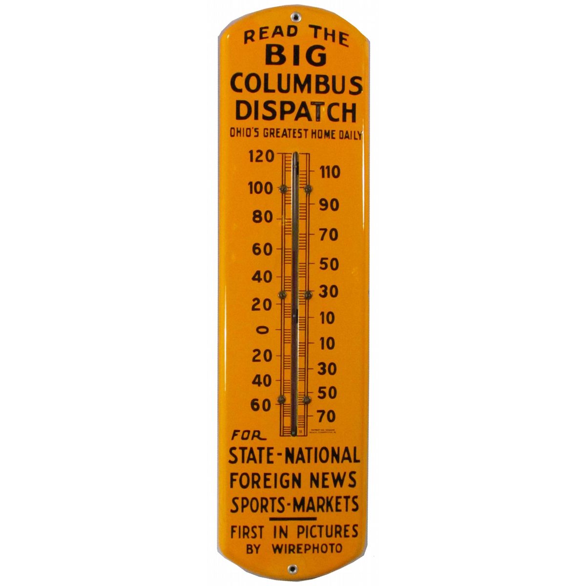 Big Columbus Dispatch Porcelain Thermometer. "Ohio's Greatest Home Daily". Repair at bottom and one side chip at 3:00 otherwise excellent condition. 7 X 27 inches.