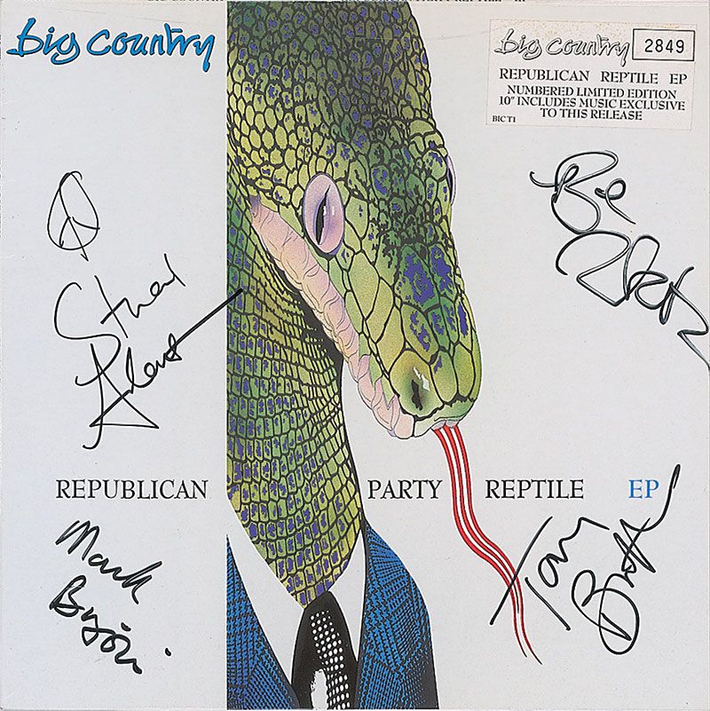 Republican Party Reptile EP signed on the front cover in black felt tip by Stuart Adamson, Mark Brzezicki, Bruce Watson, and Tony Butler. In fine condition, with a promotional label affixed to top right. The record is included. Accompanied by a full letter of authenticity from Roger Epperson/REAL.