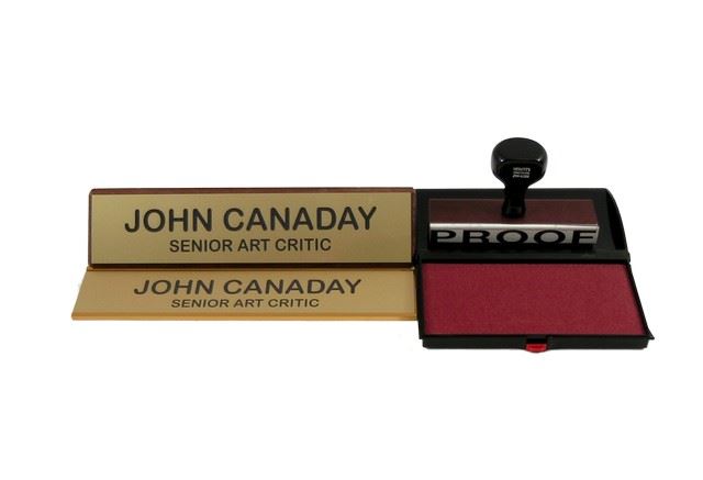 John Canaday (Terence Stamp) screen used, hero, 'John Canaday Senior Art Critic' name plates and Proof stamp. (approx. 10" long)